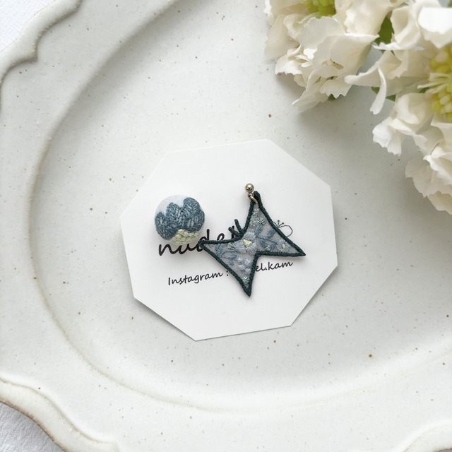 ○手刺繍ピアス○ 刺繍やレース、ビーズなど様々なパーツを組み合わせて丁寧に作られています。 ひとつひとつデザインが違うので、世界に一つだけの特別な耳飾りです。 ※写真はピアスですが、イヤリングへのパーツ交換も可能です。 ご購入の際にご希望の金具をお選びください。 ※ピアス、イヤリングいずれか1点のみになります。 両方のご購入はできませんのでご注意ください。 size : 左 縦約6cm、横約1.5cm 右 縦約5cm、横約2.2cm (金具を含まないモチーフ部分の大きさです) 金具部分の素材 : メッキ |Nadel| 主にお花・ちょうちょ・トリなどのモチーフを手刺繍で制作し、異素材のものとミックスしてアクセサリーを作っております。 長く愛用してもらえるように、細部までこだわって仕上げております。 幸せをお届けできますように~♥️ そして、時々布こものやお花雑貨も。