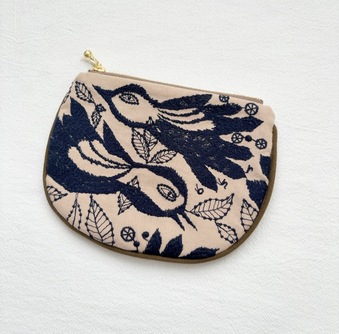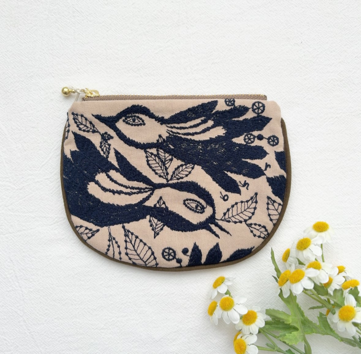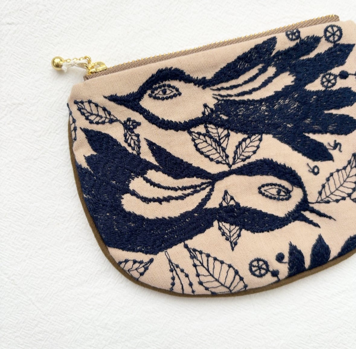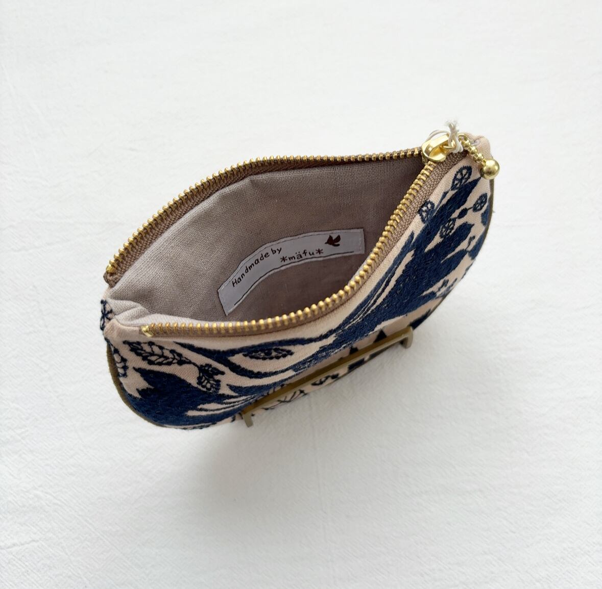ミナペルホネンの生地を使用して作られたファスナーポーチ。