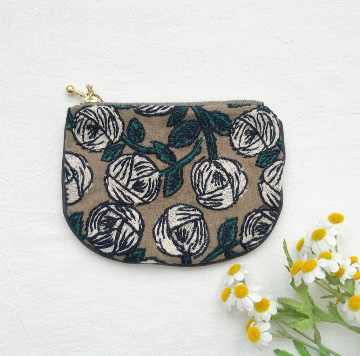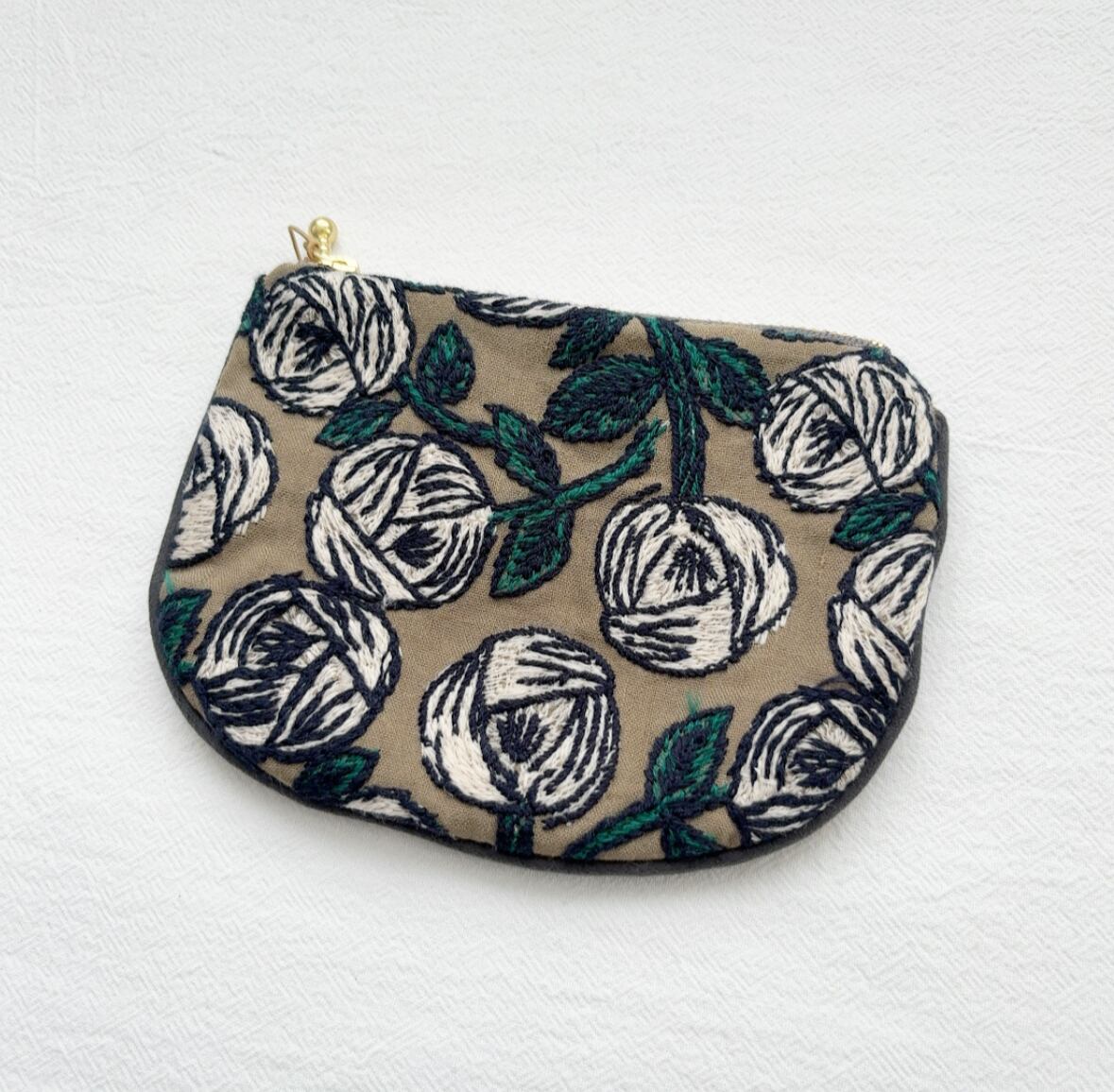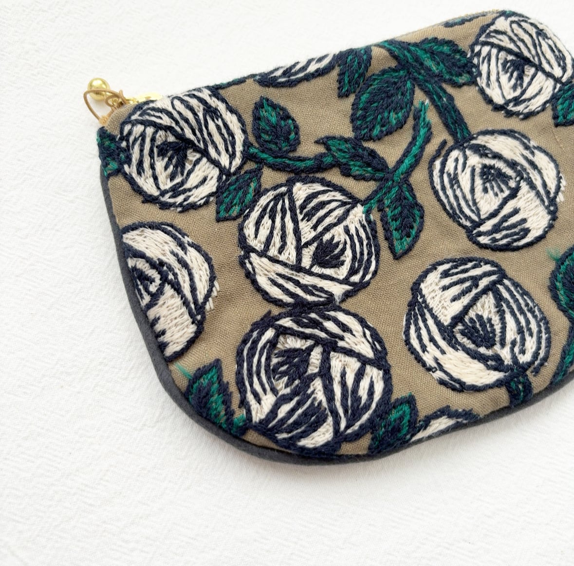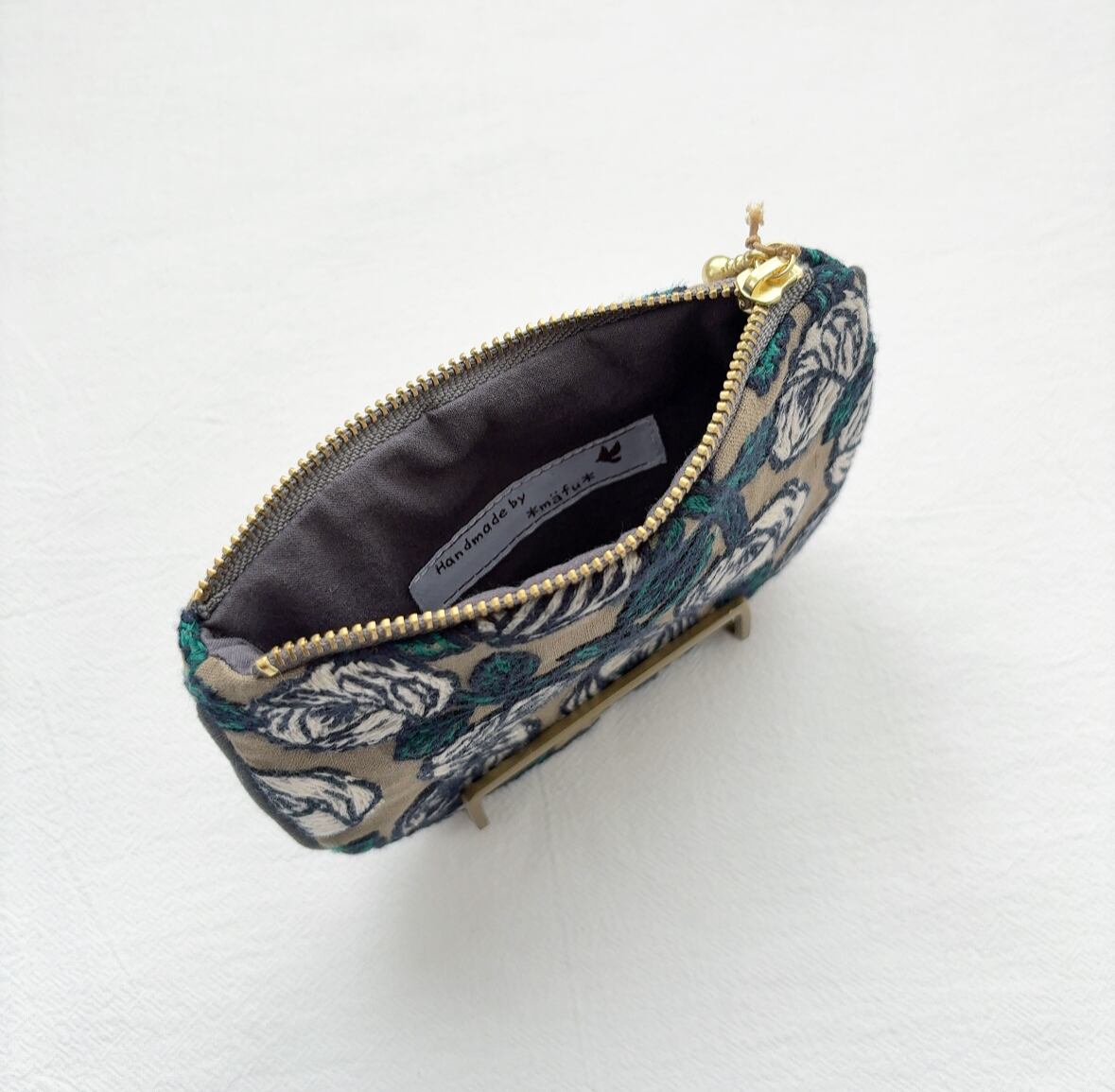 ミナペルホネンの生地を使用して作られたファスナーポーチ。