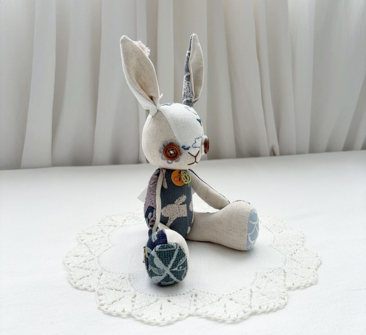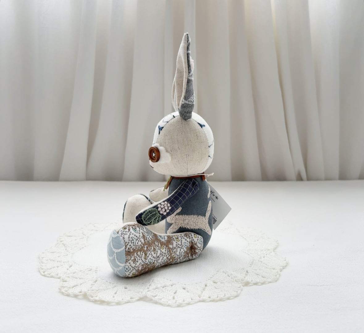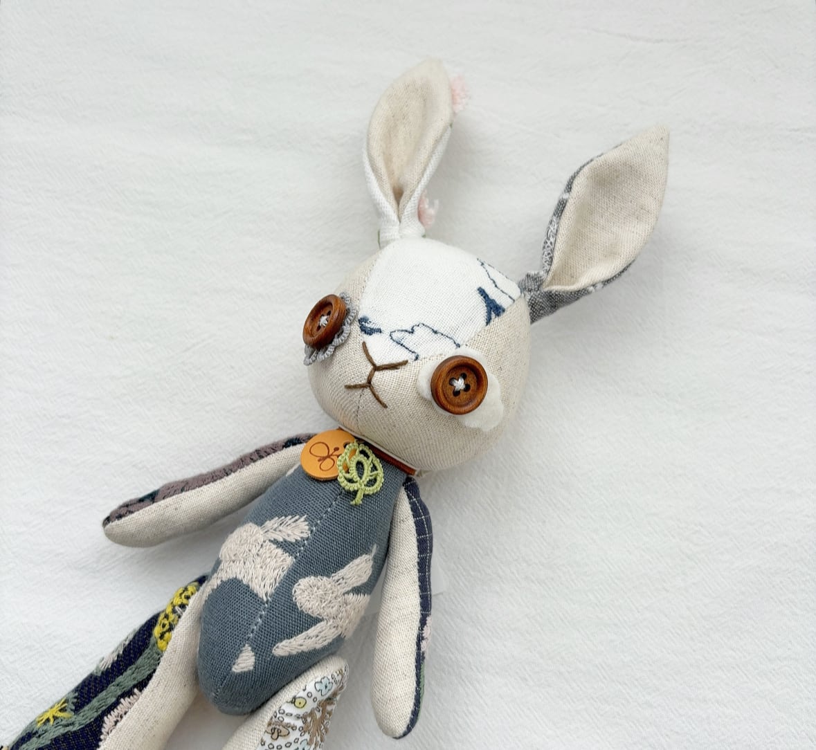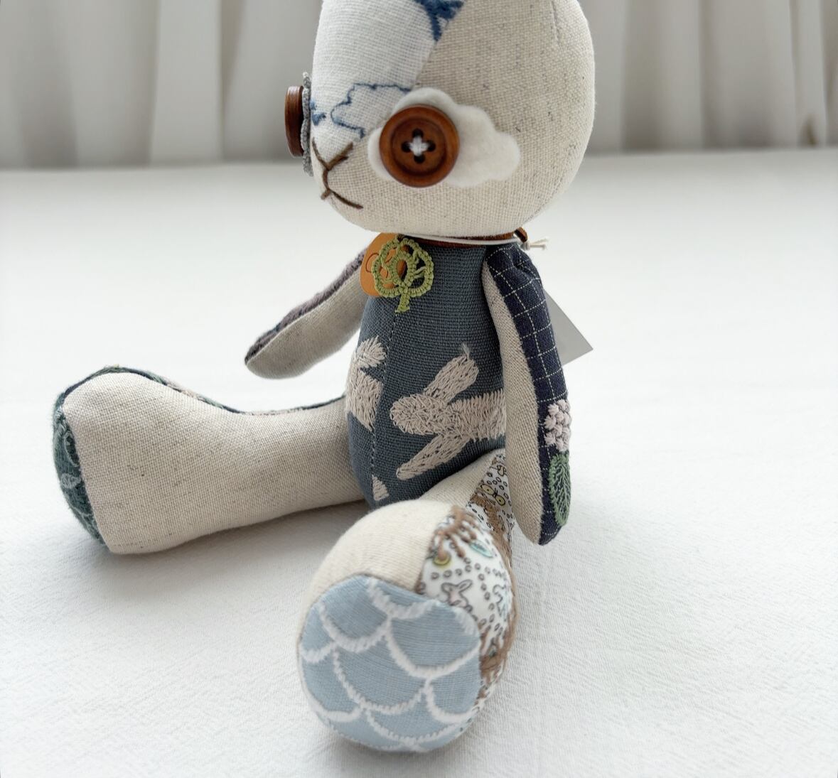 耳のうしろや足の裏まで、身体のあちこちに色々な生地が使われています。