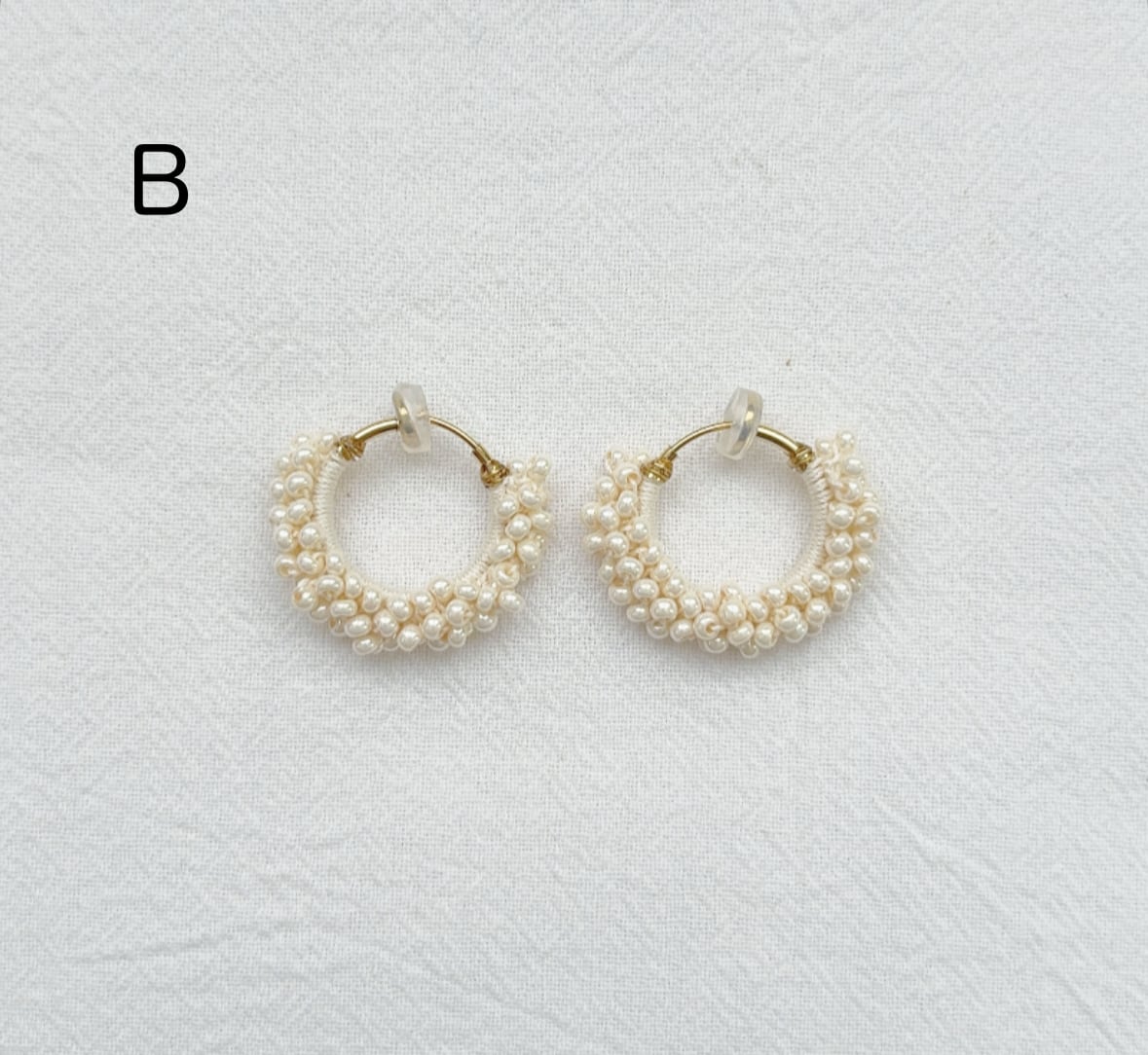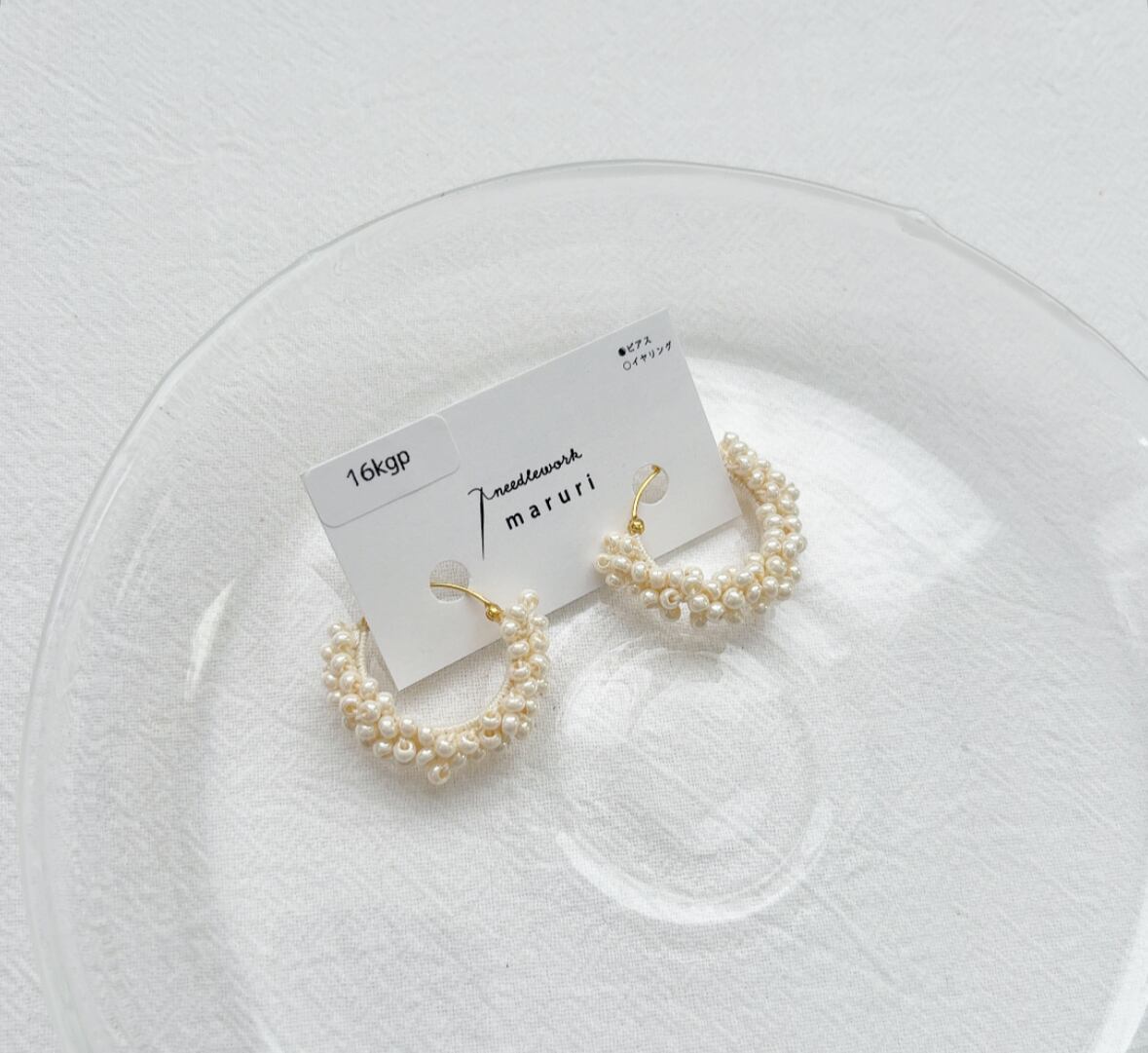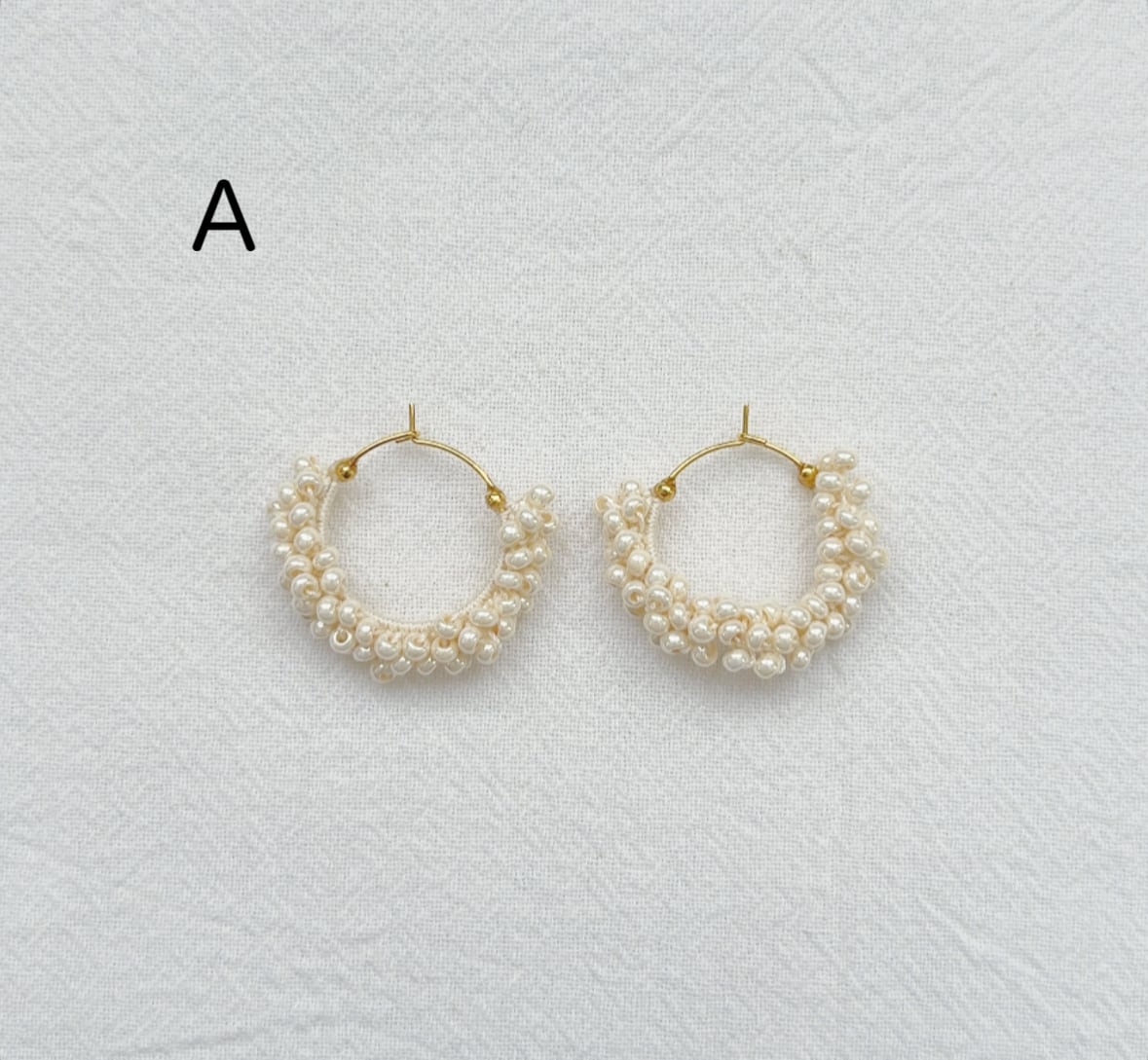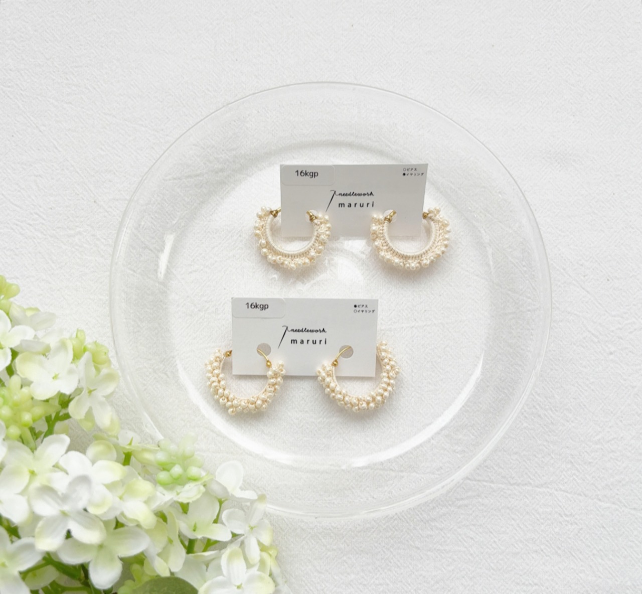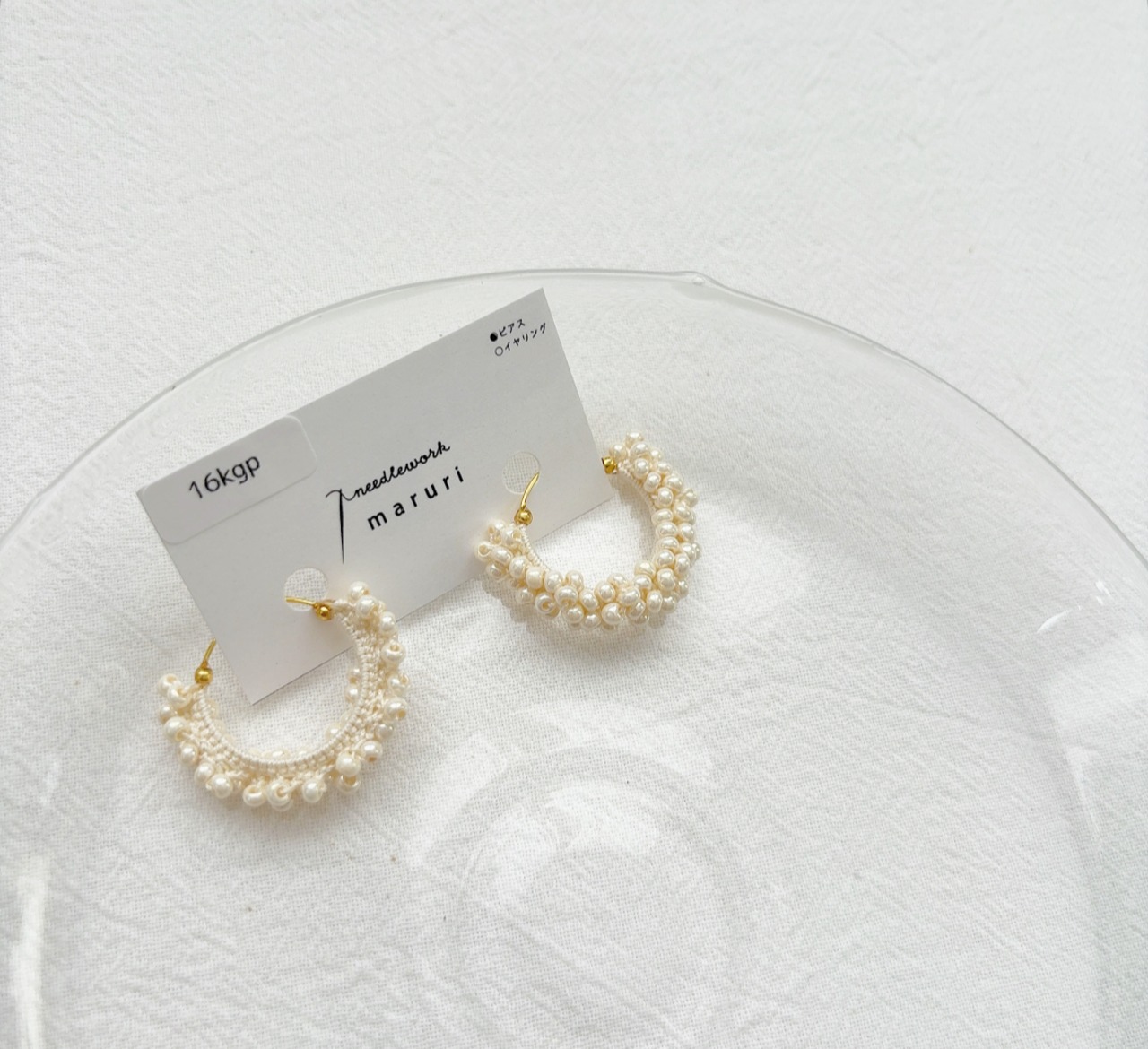 レース糸でビーズを編み込んで作られたフープピアス&イヤリングです。