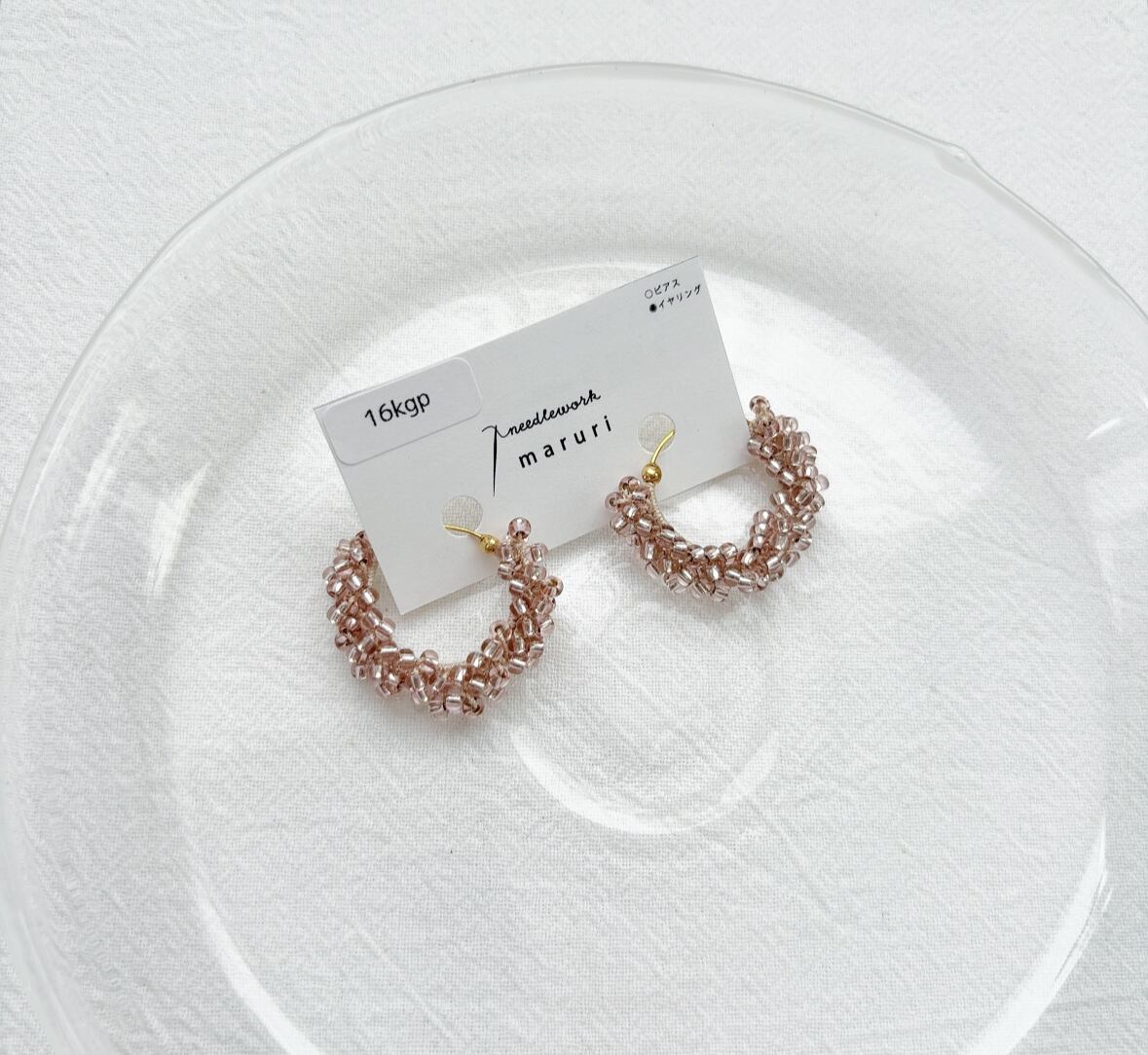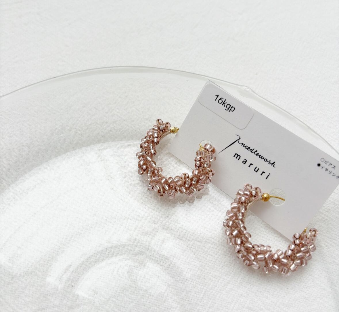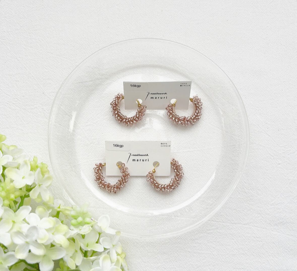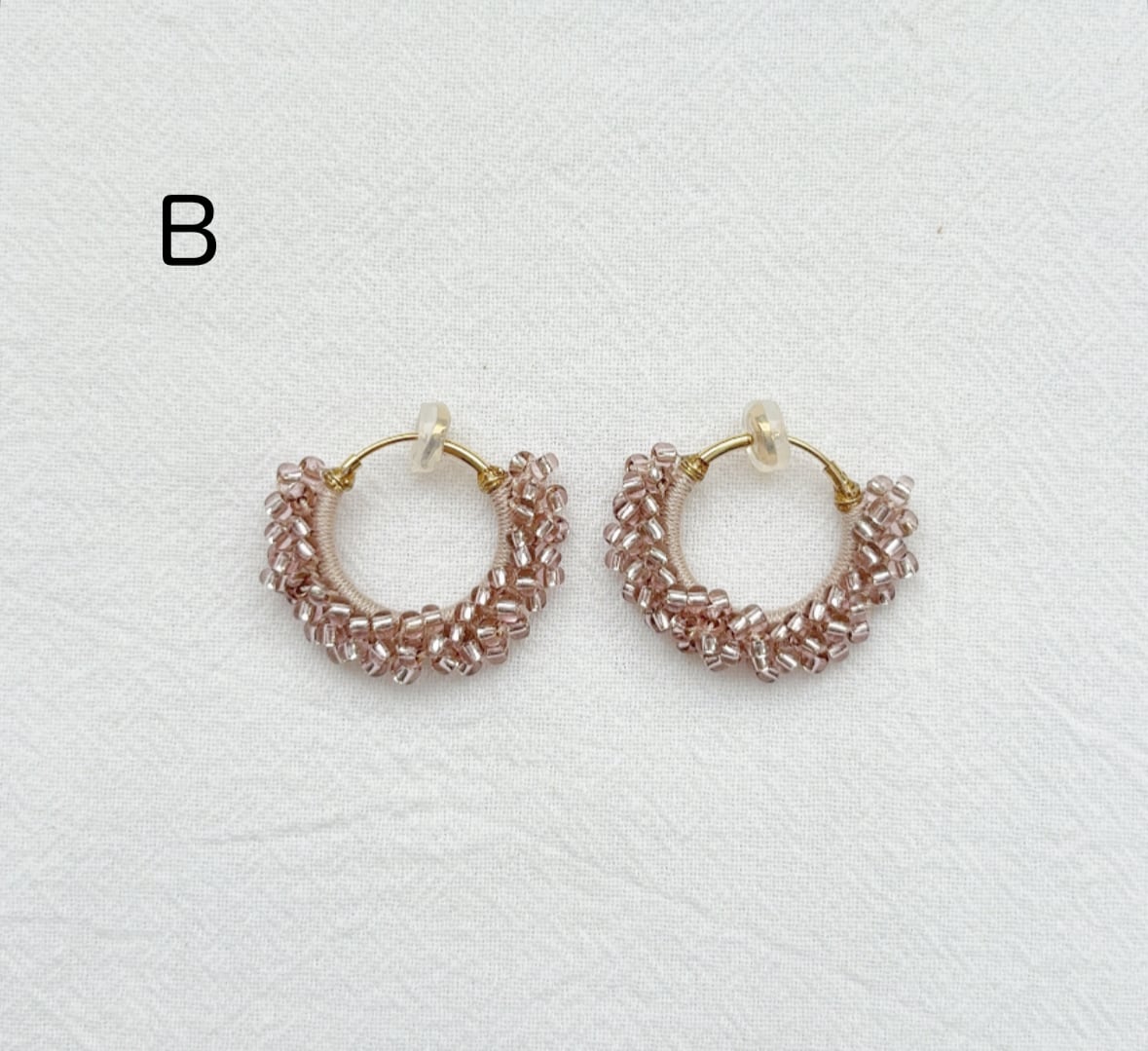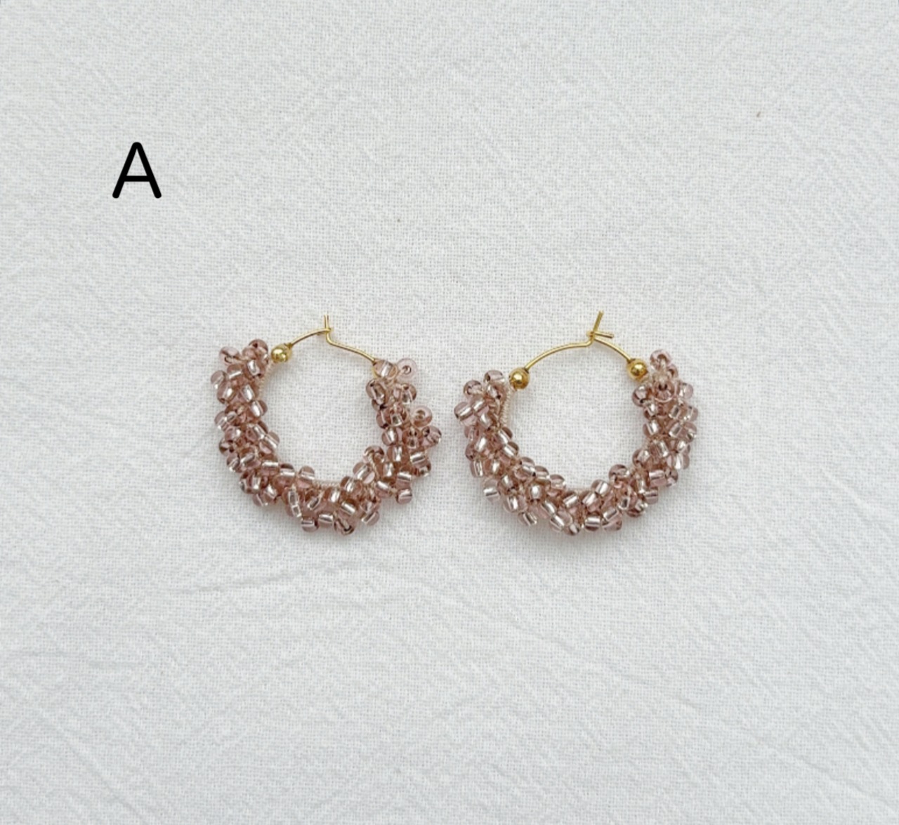 レース糸でビーズを編み込んで作られたフープピアス&イヤリングです。