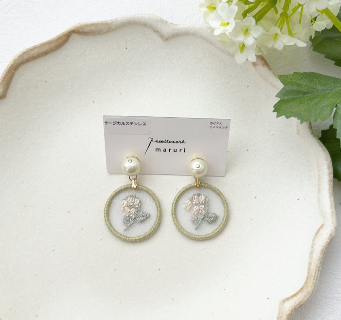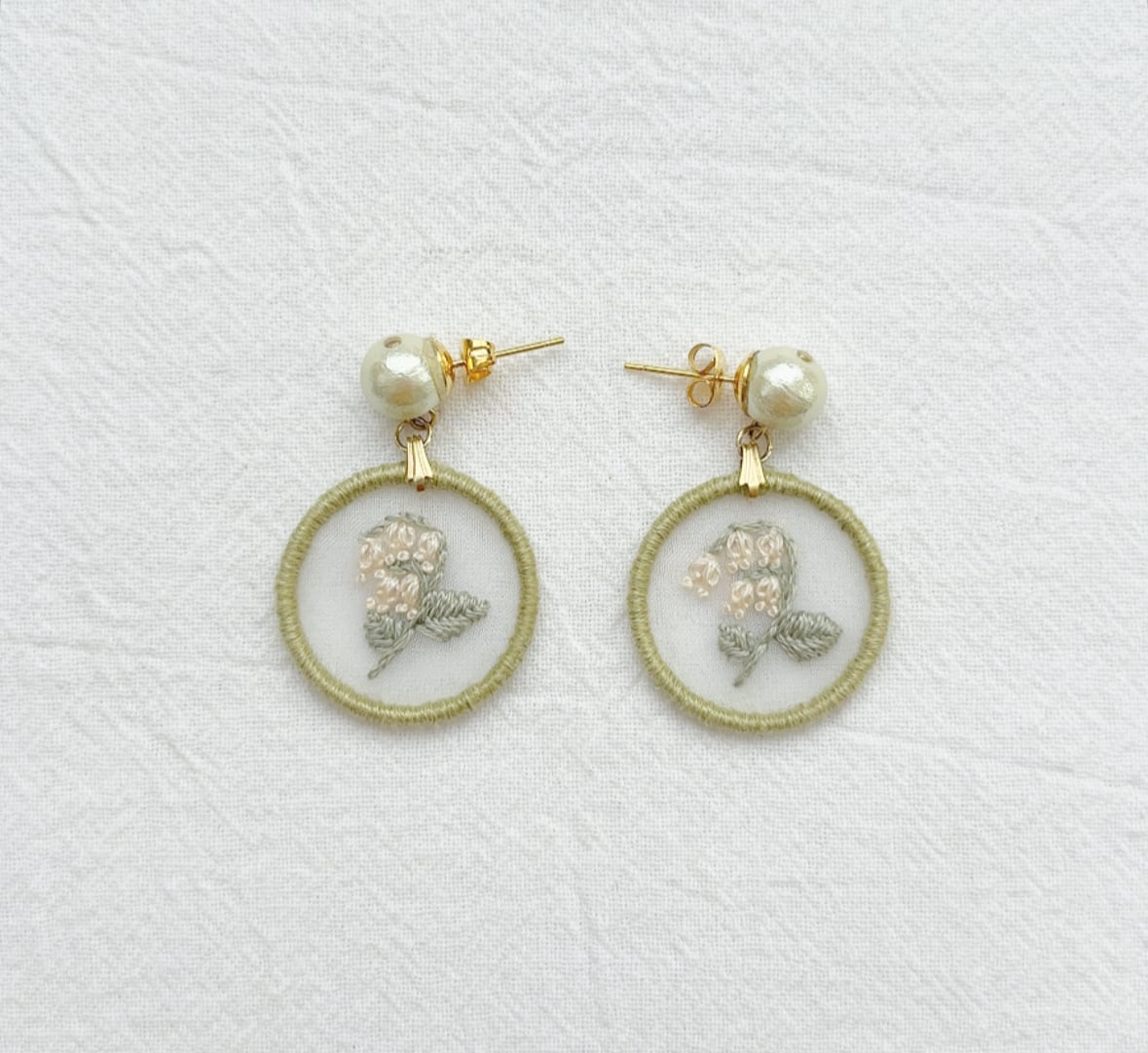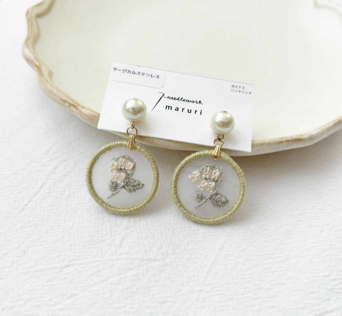 オーガンジー生地にすずらんの刺繍を施した耳飾り。