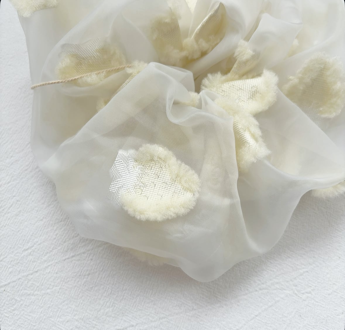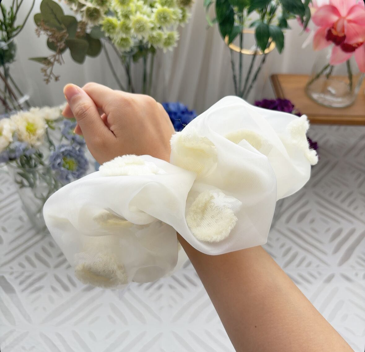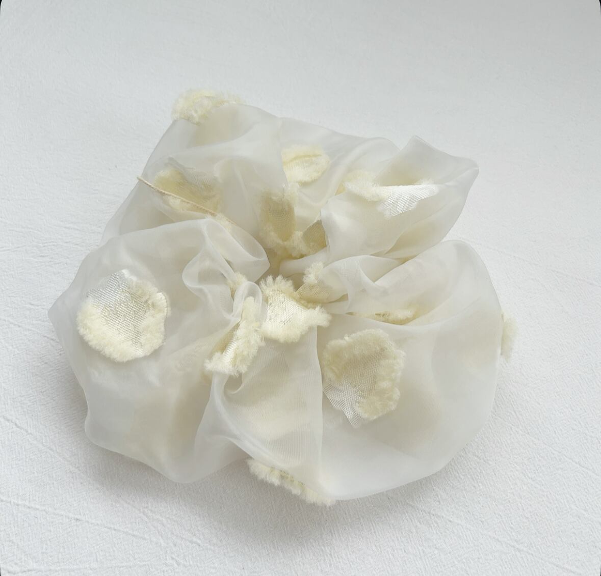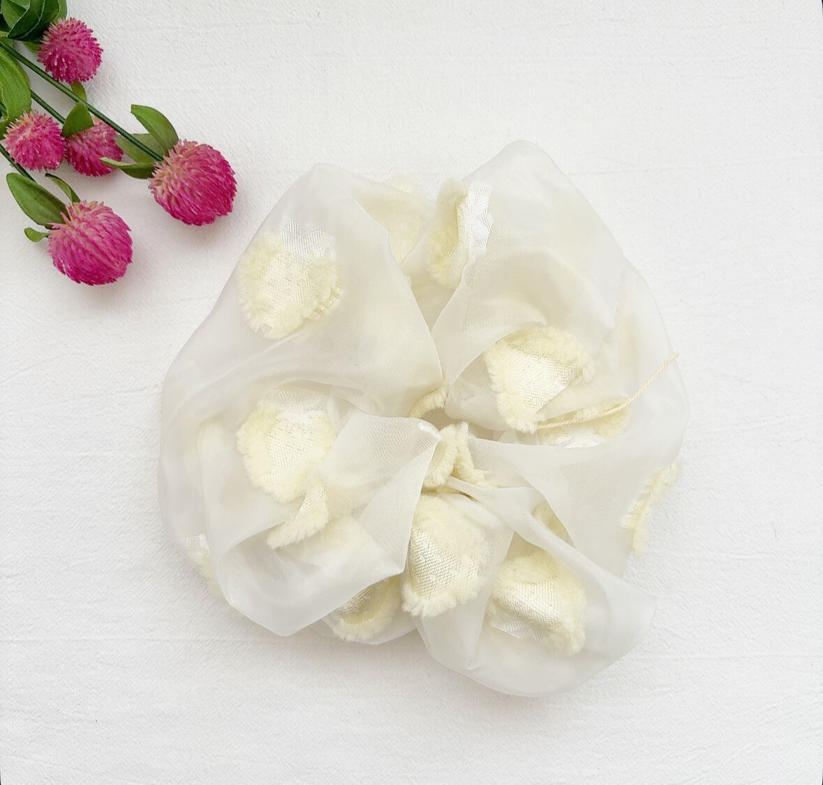 前から見た時や、ちょっと横を向いた時に、シュシュがチラッと見えるのもビックシュシュならではの可愛さです。