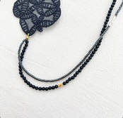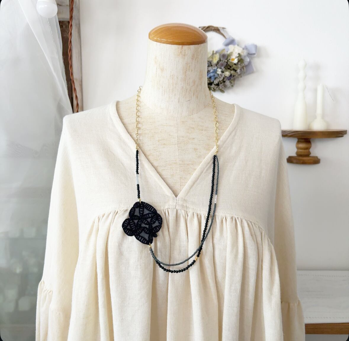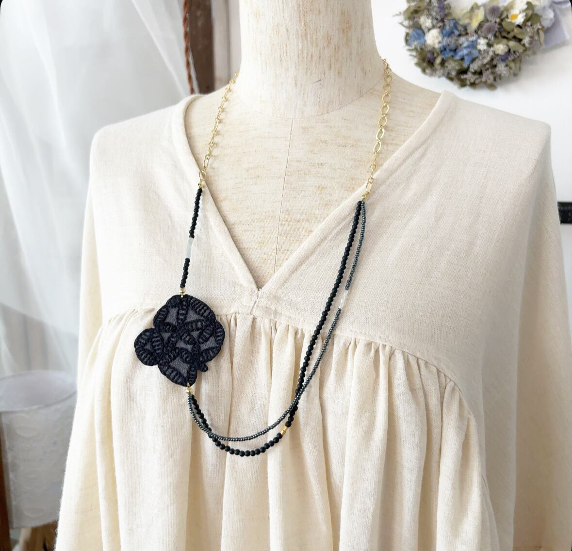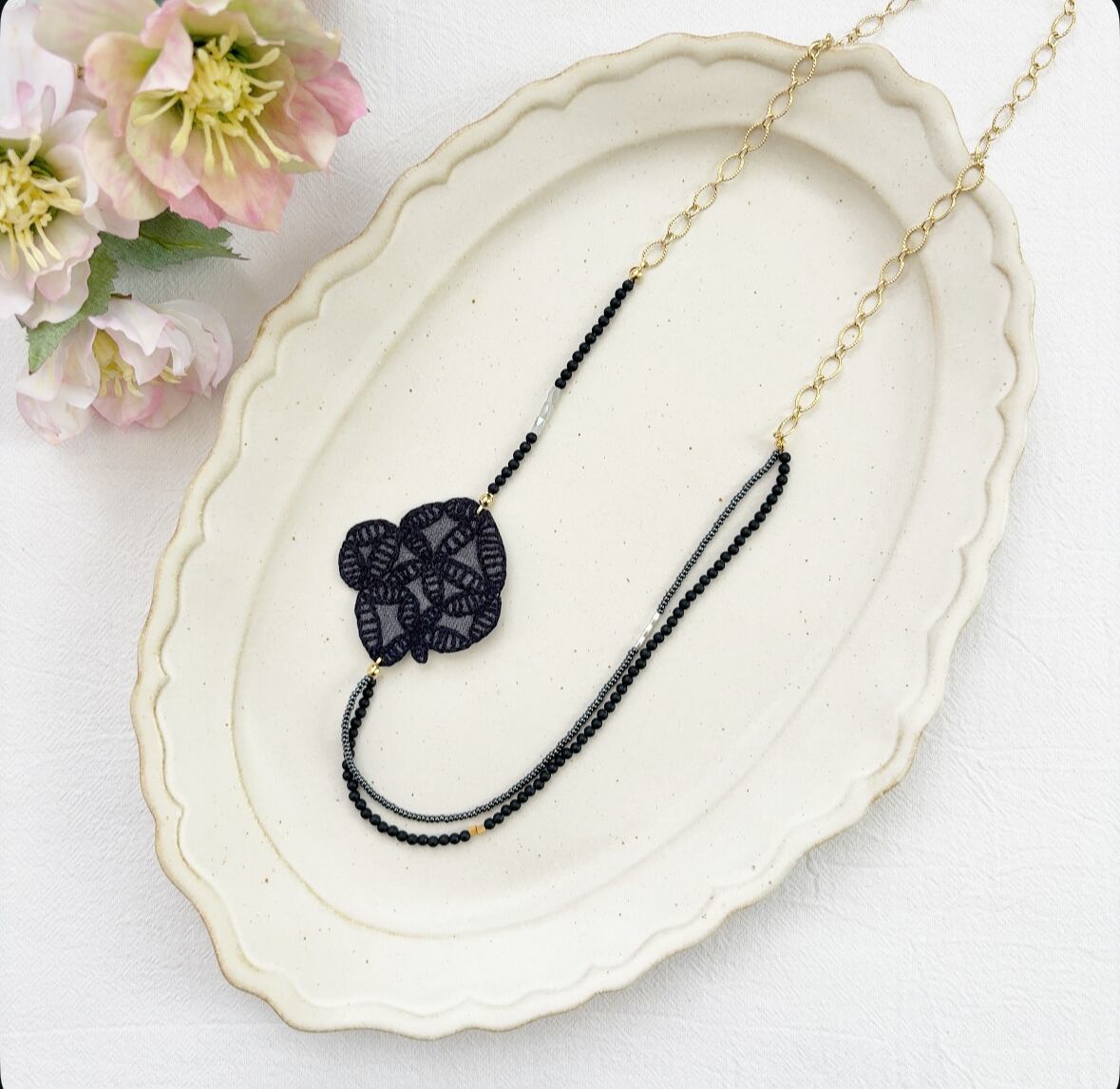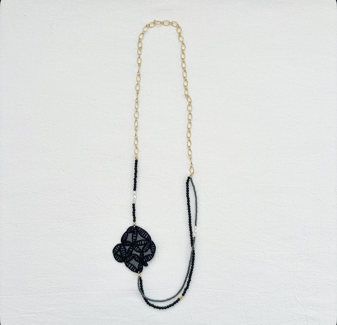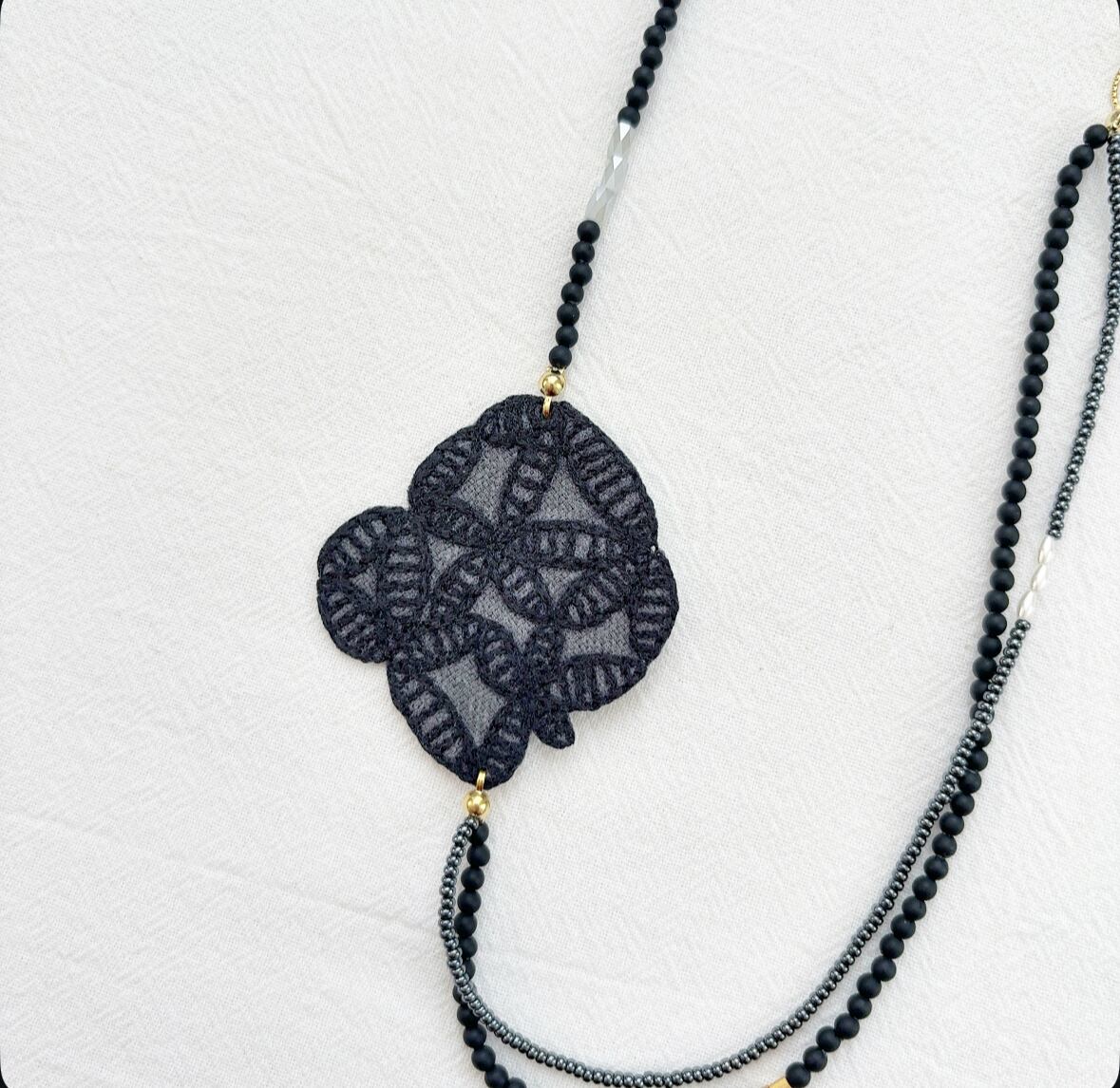 ミナペルホネンのかけらを使って作られたネックレス。
