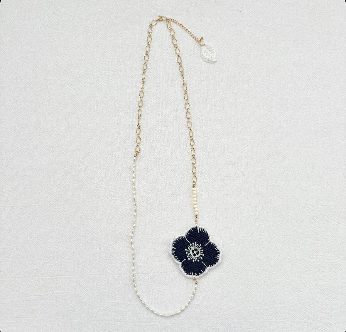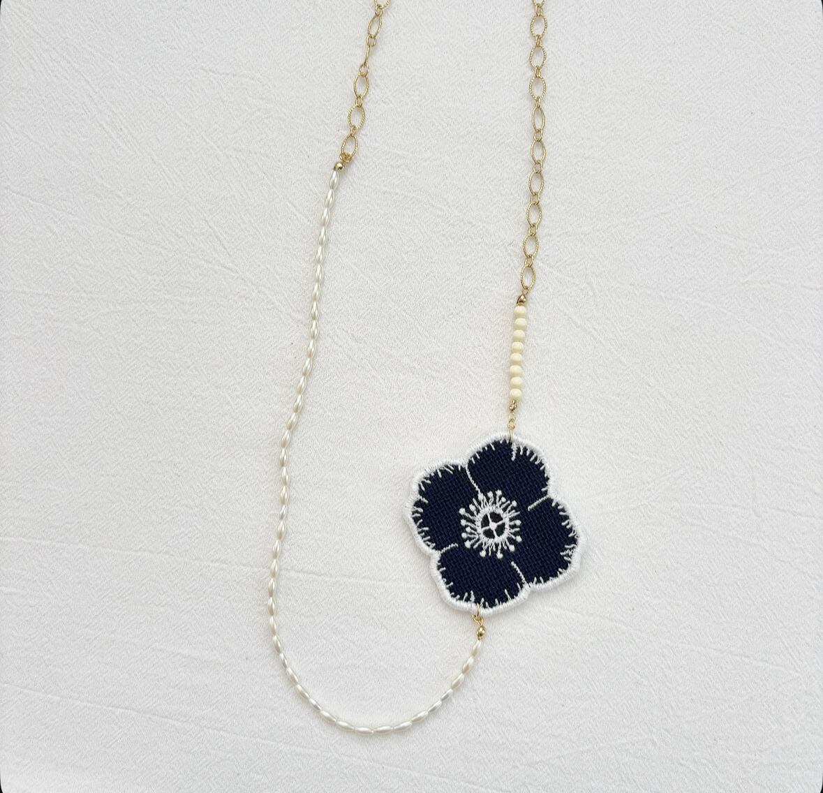 ミナペルホネンのかけらを使って作られたネックレス。