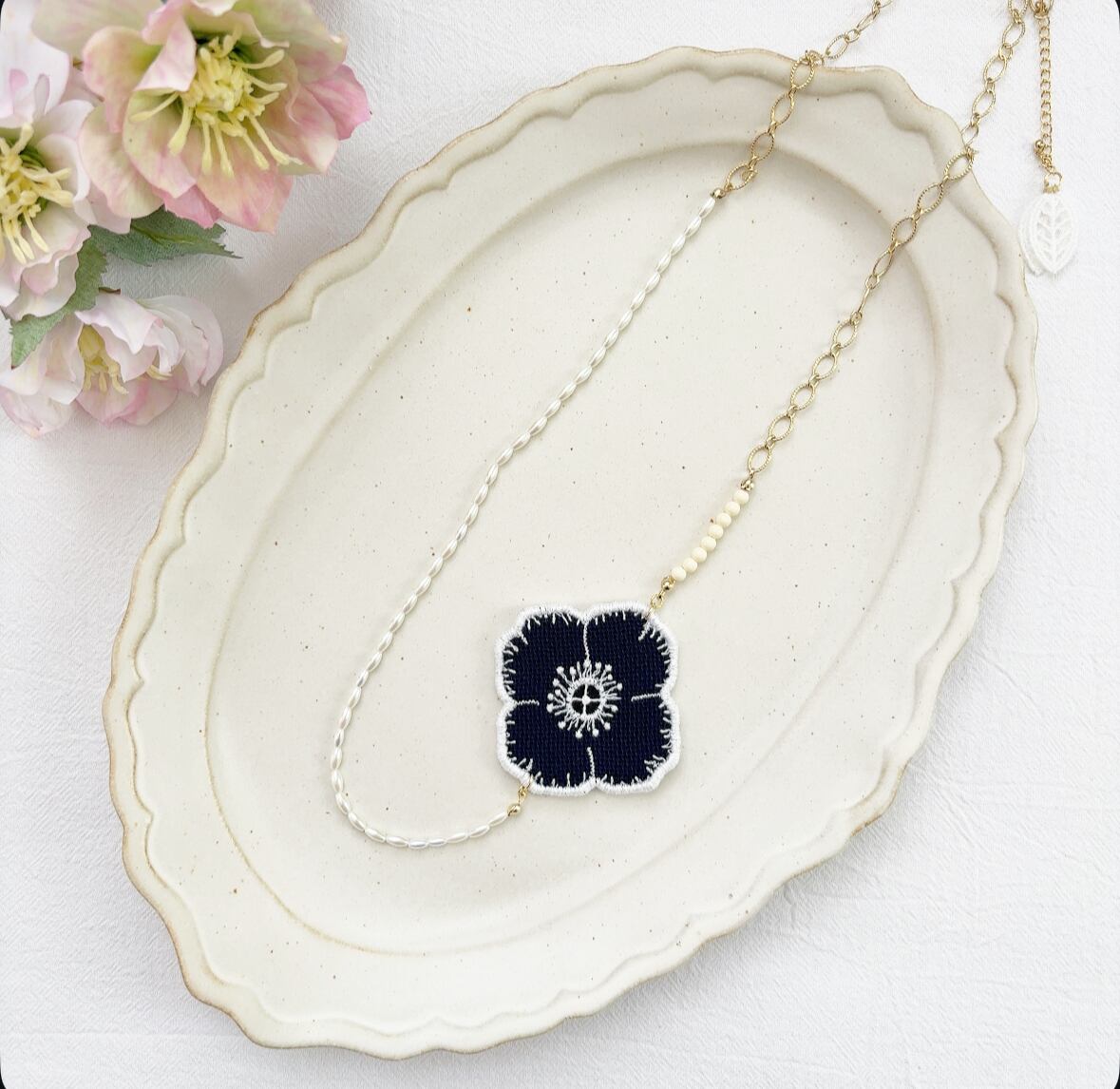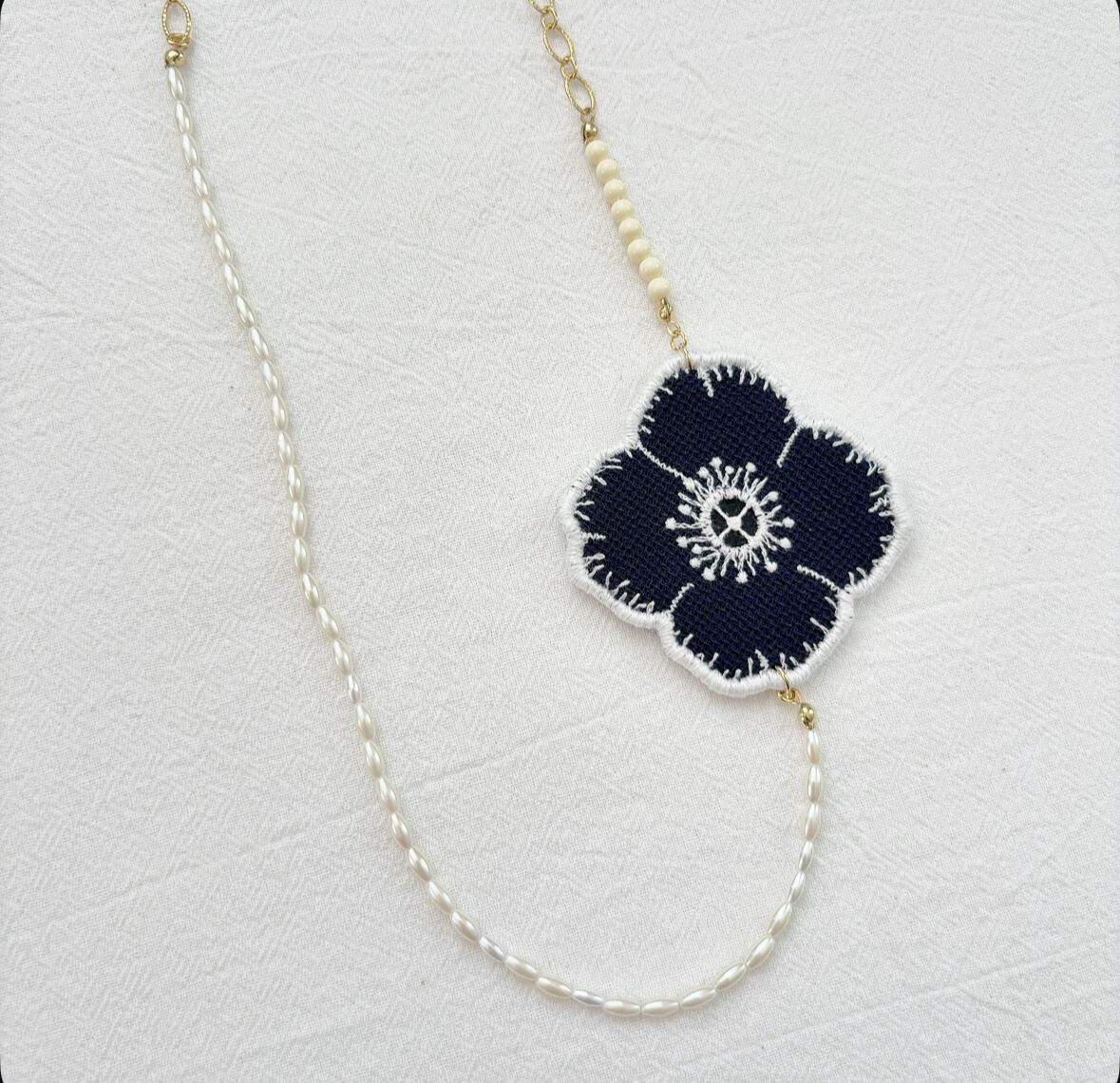 主にお花・ちょうちょ・トリなどのモチーフを手刺繍で制作し、異素材のものとミックスしてアクセサリーを作っております。
