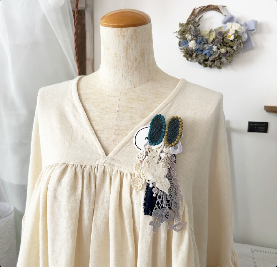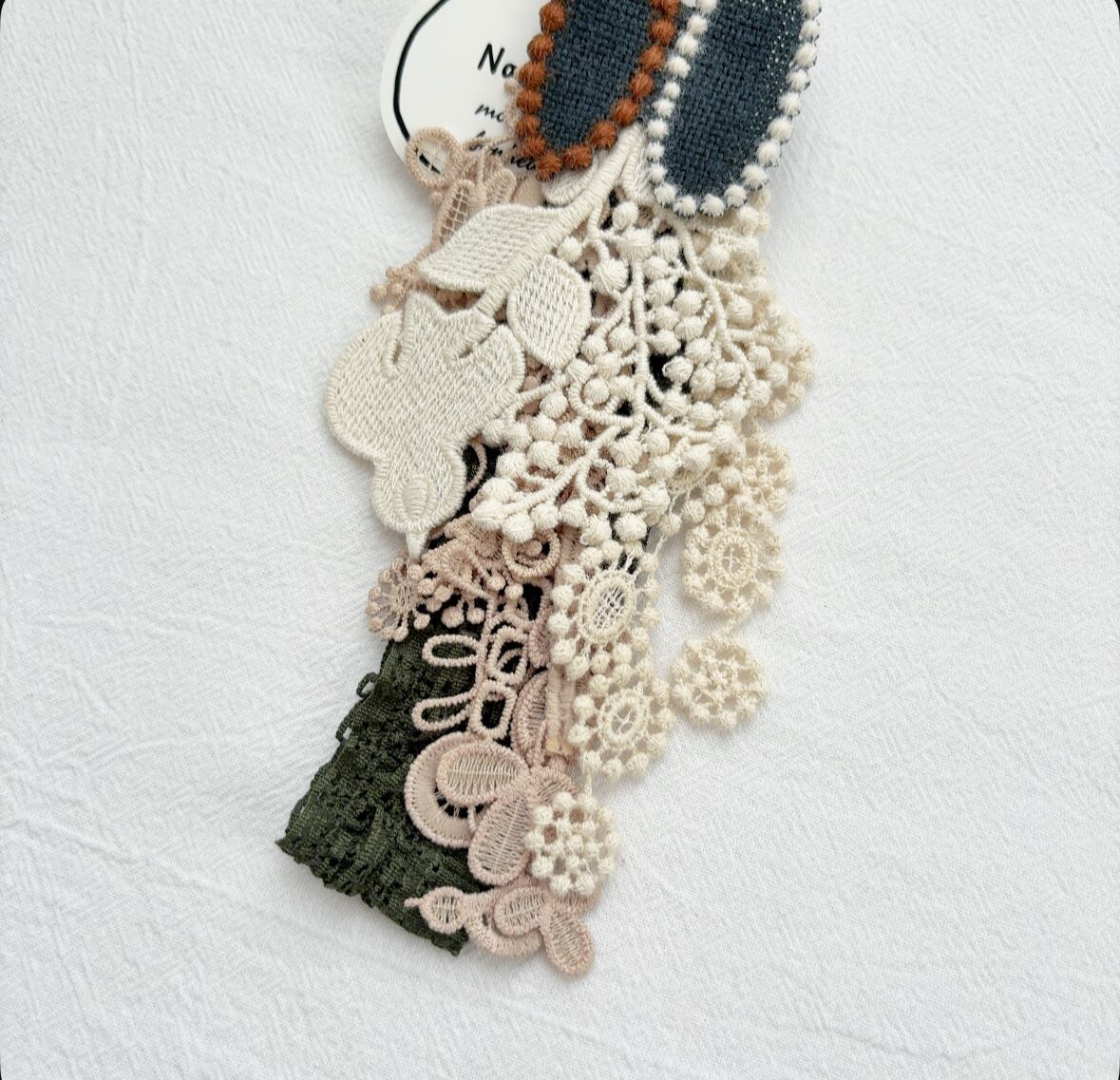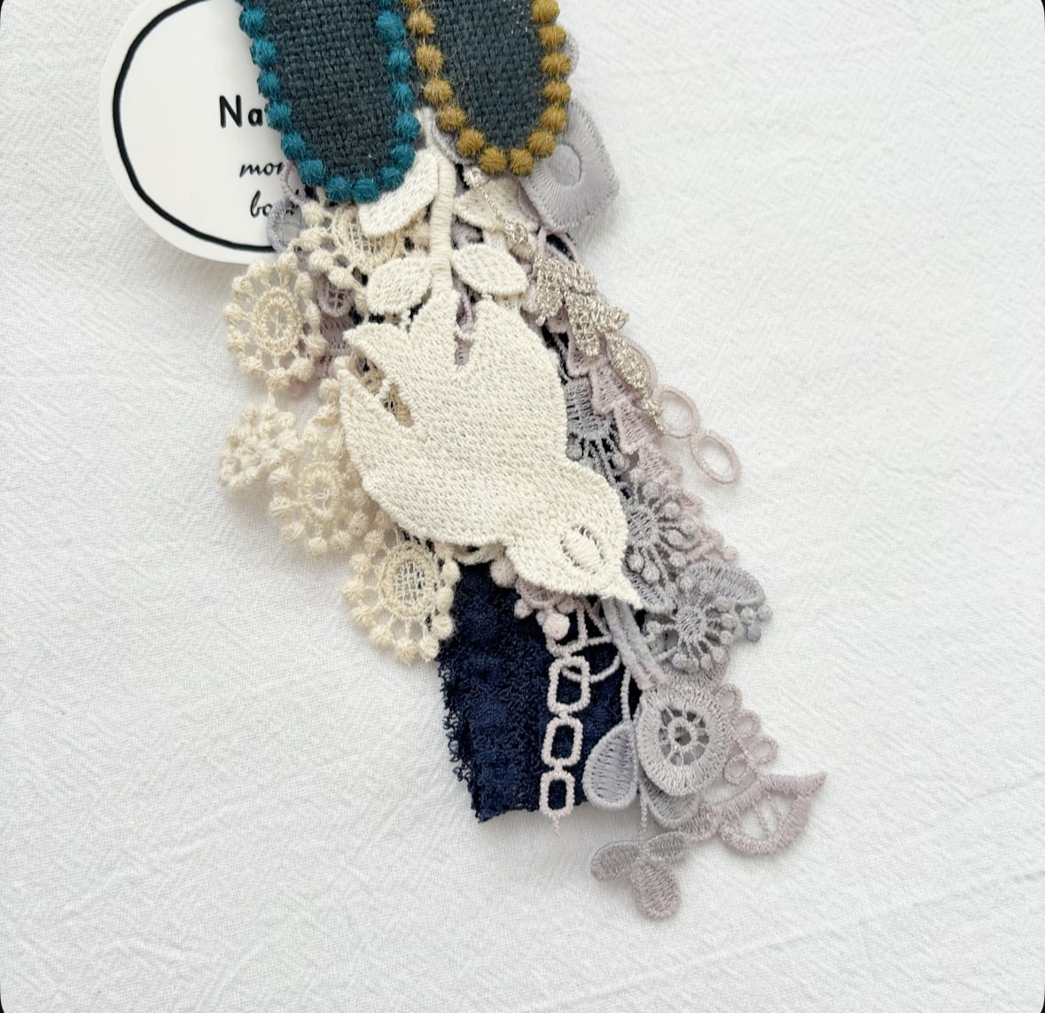 ミナペルホネンのかけらとレースを贅沢に使って作られたピンプローチです。