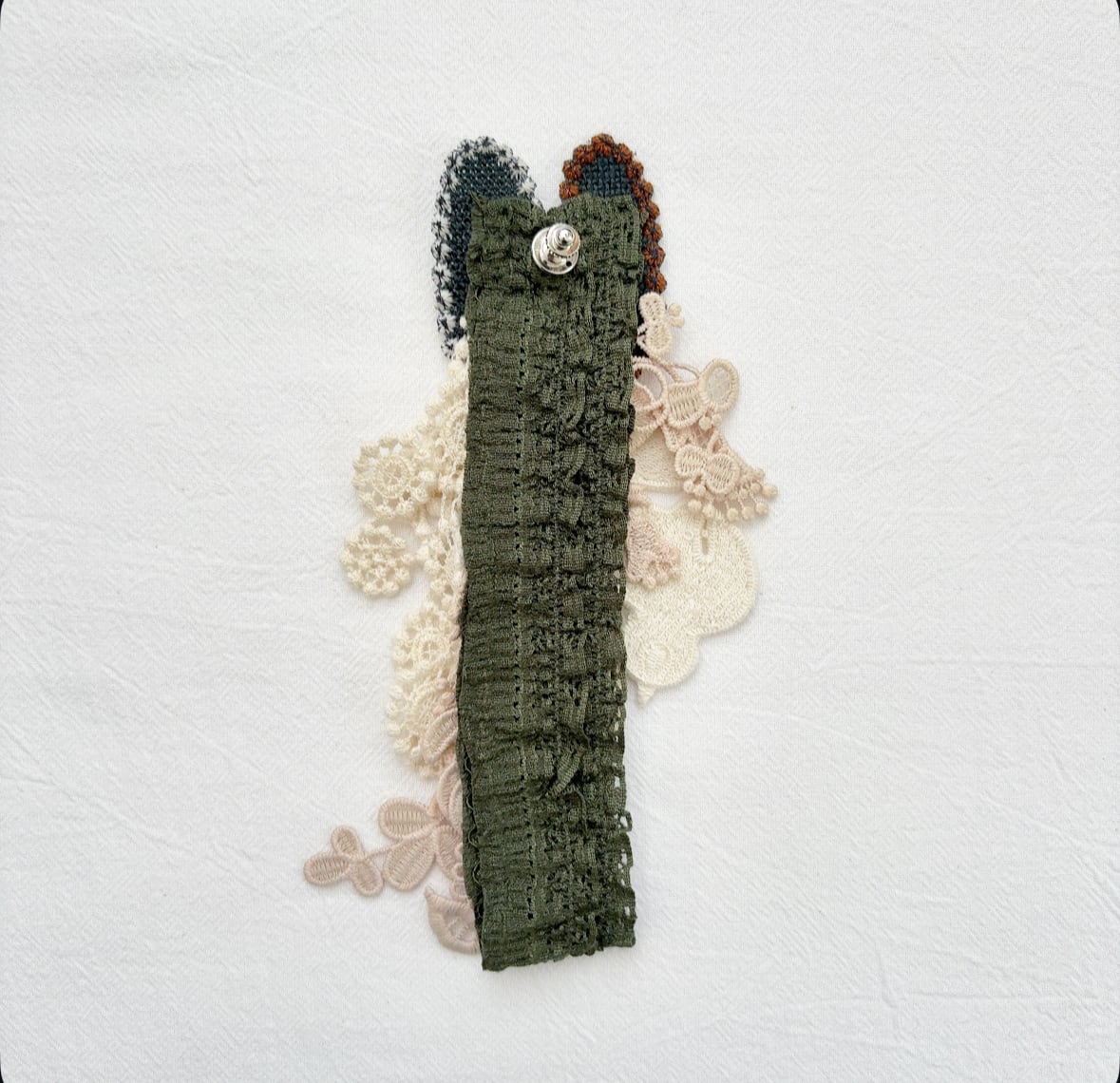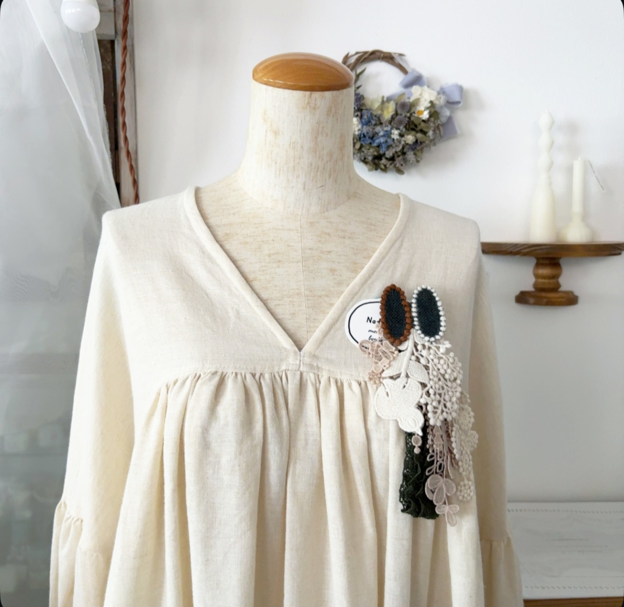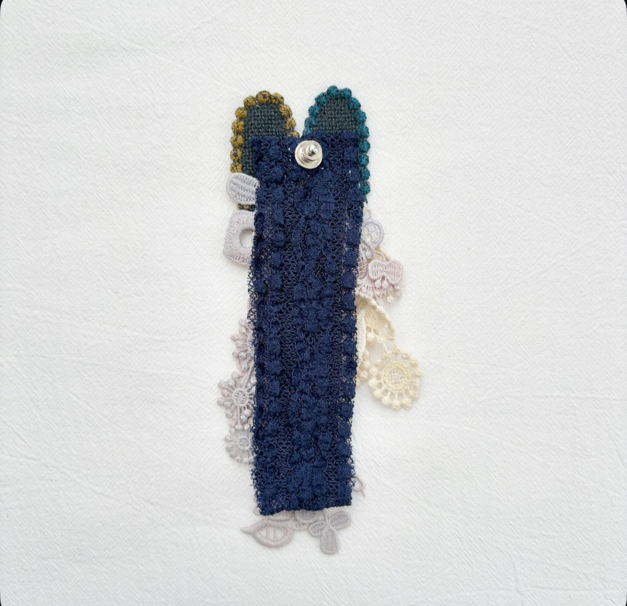 ミナペルホネンのかけらとレースを贅沢に使って作られたピンプローチです。