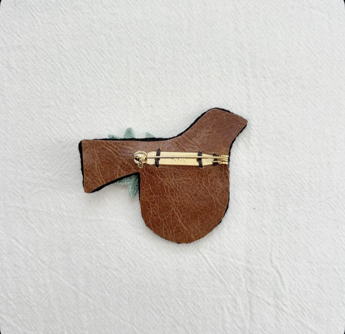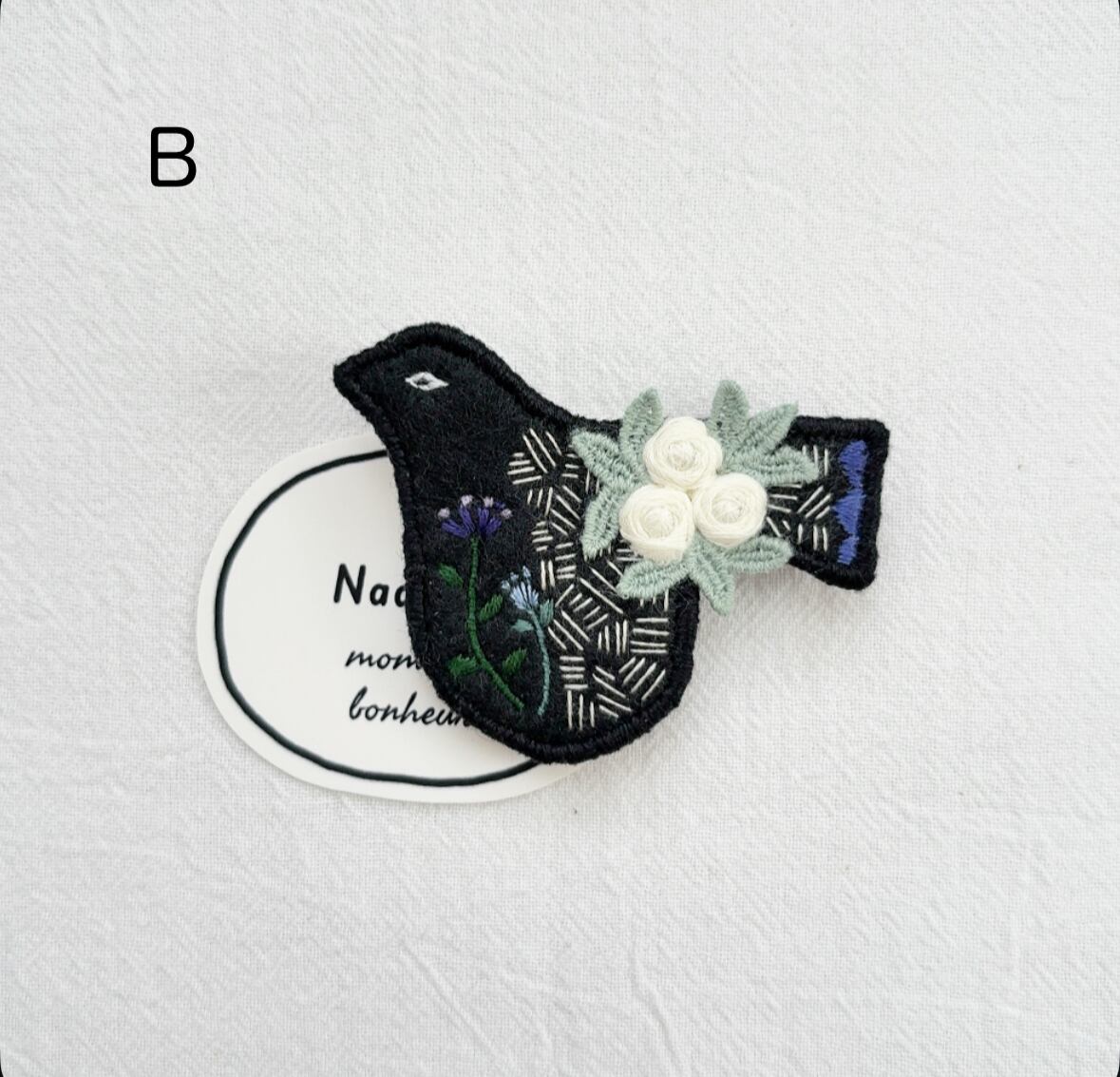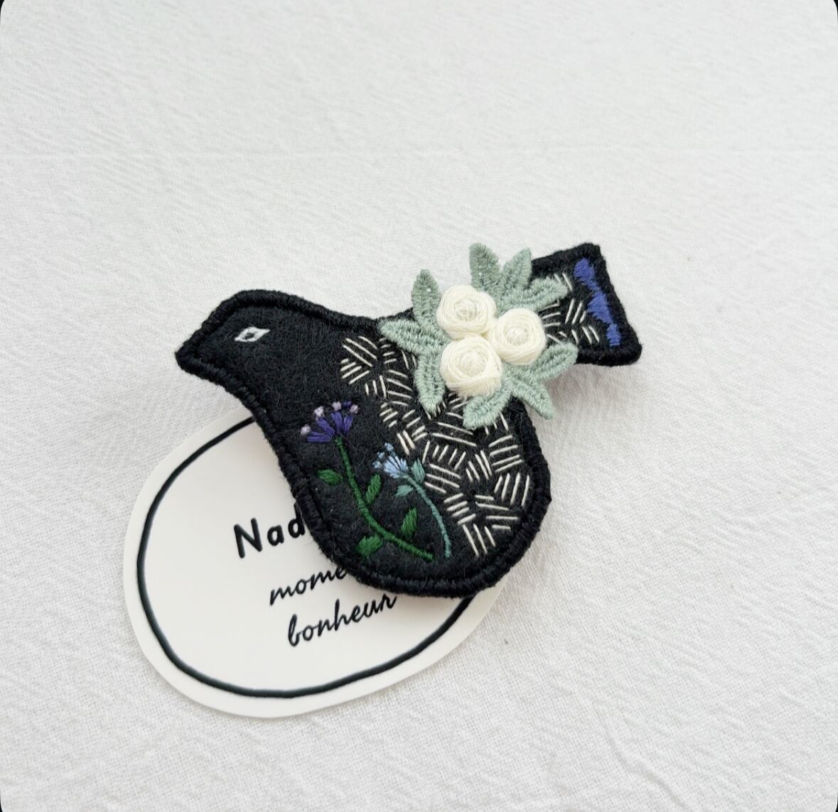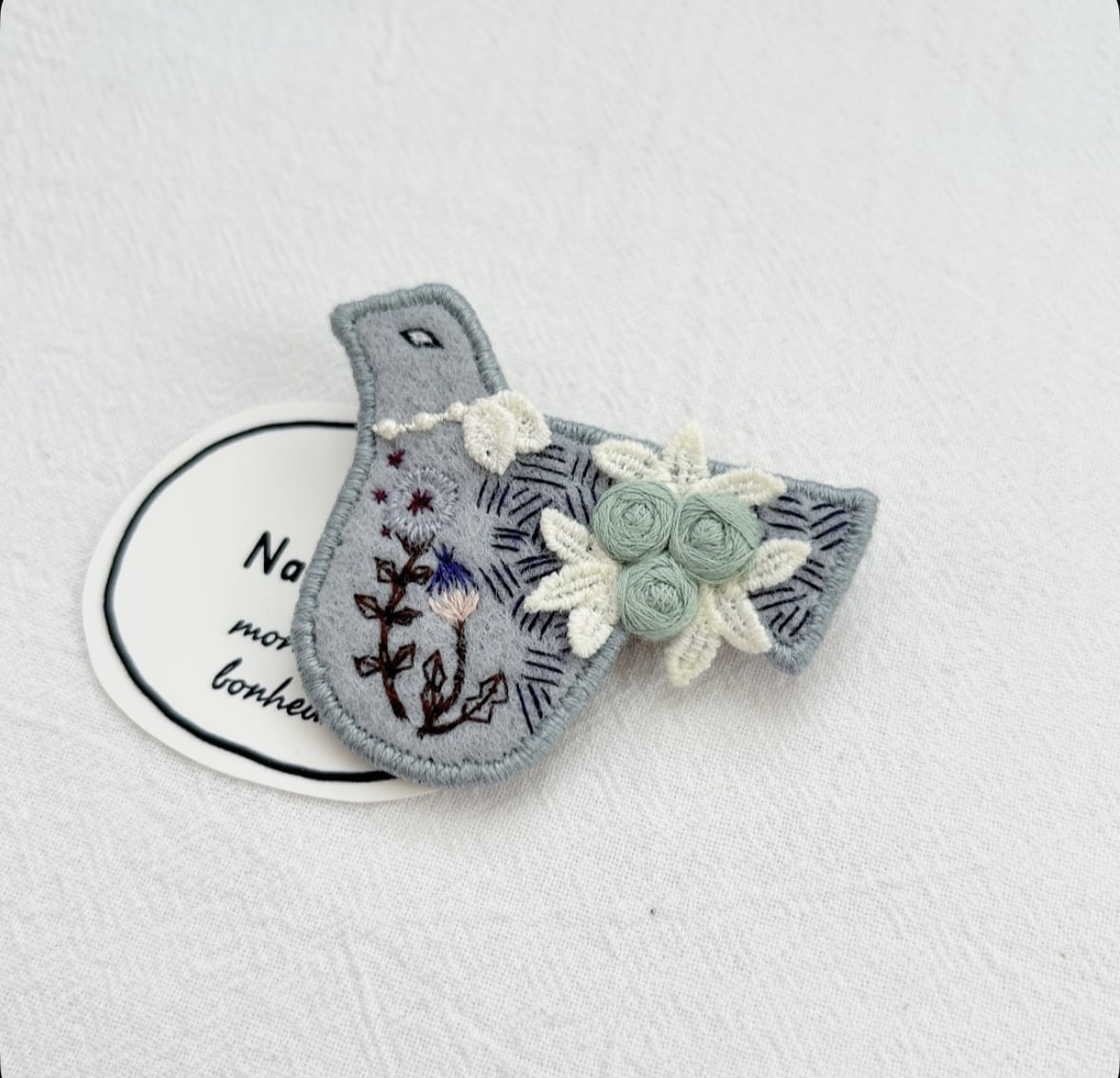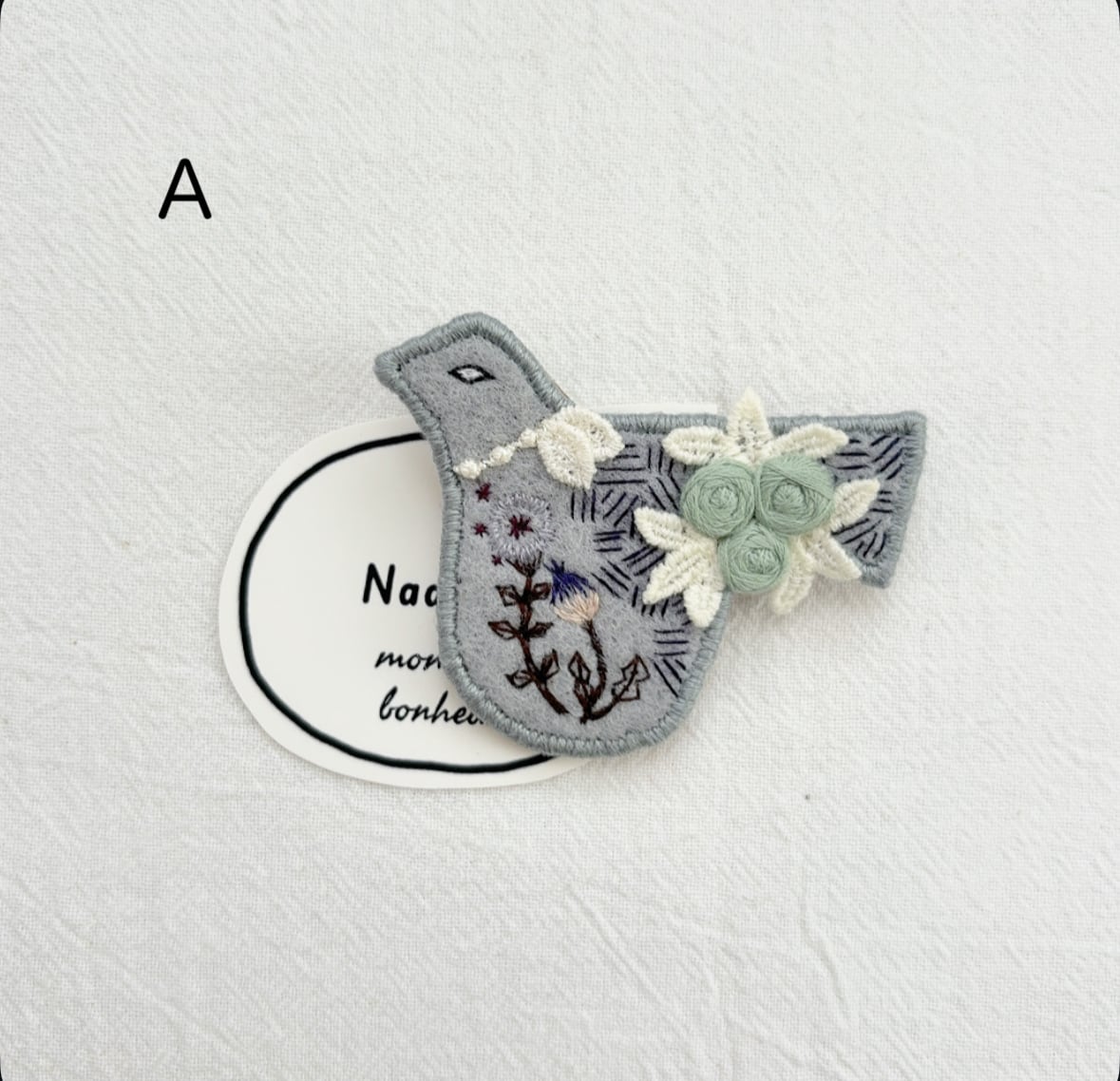 トリさんモチーフにお花を丁寧に手刺繍して作られたブローチ。
