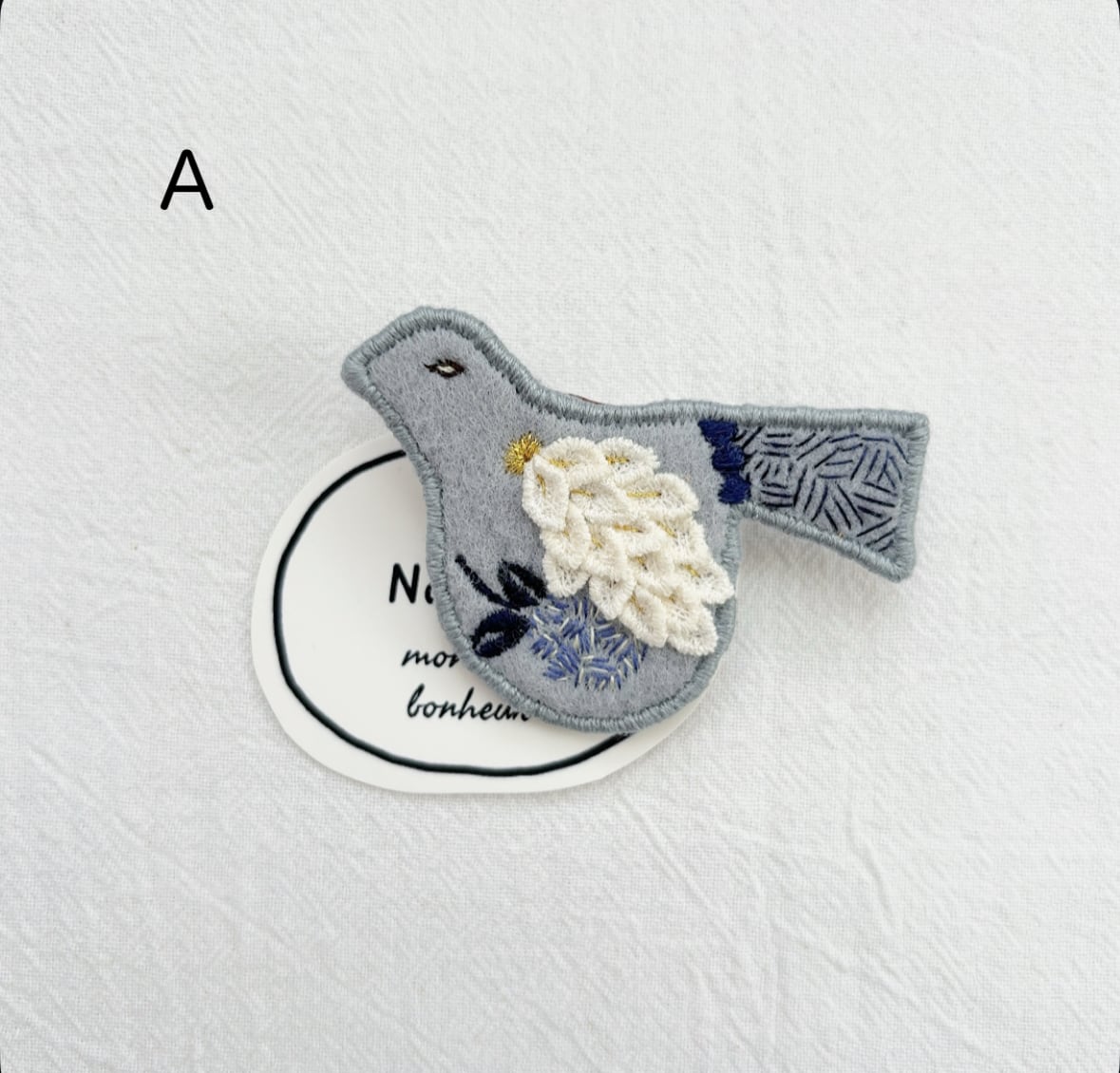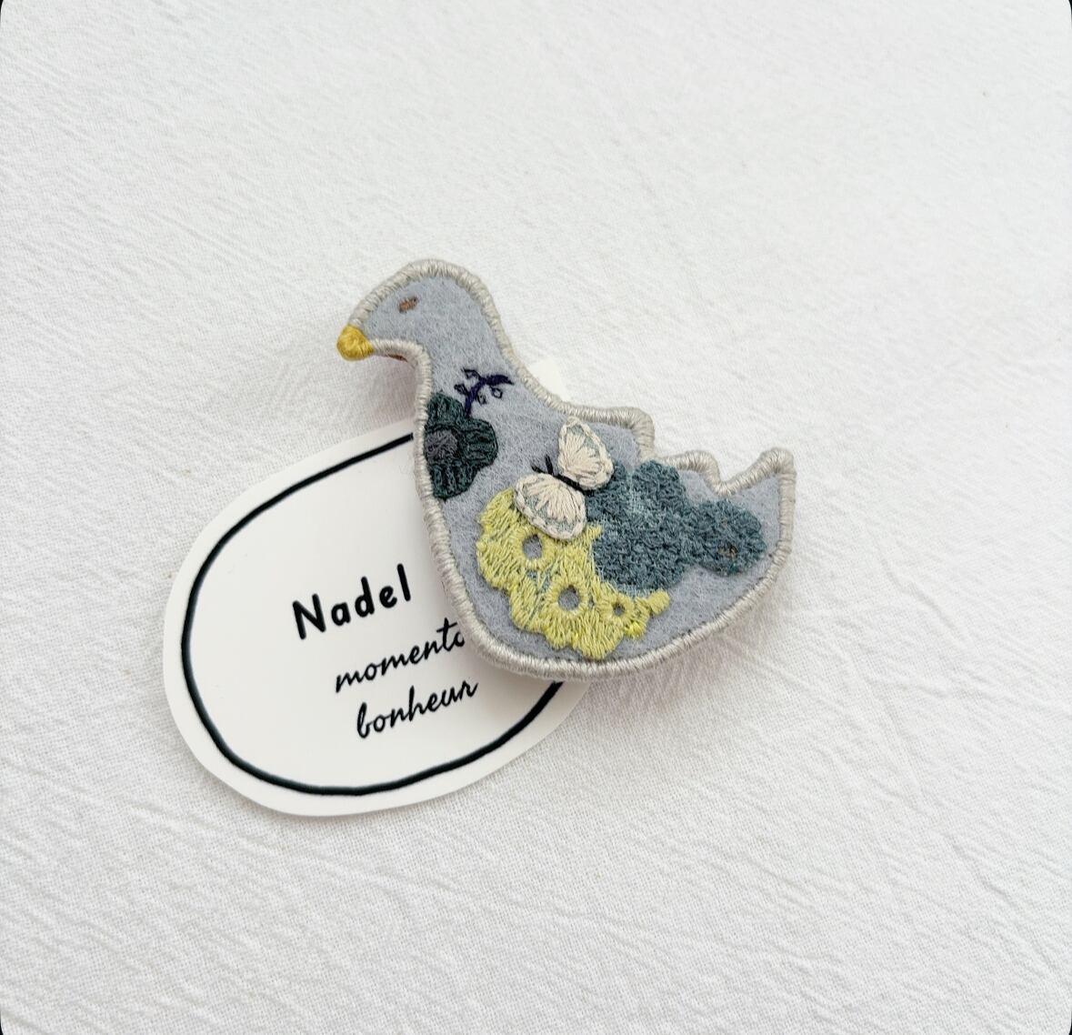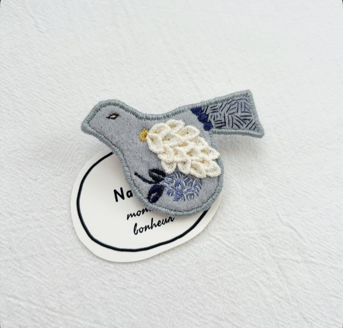 トリさんモチーフにお花を丁寧に手刺繍して作られたブローチ。