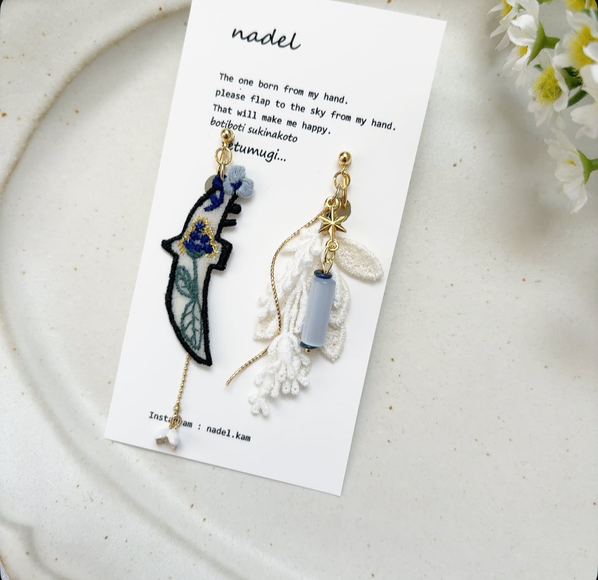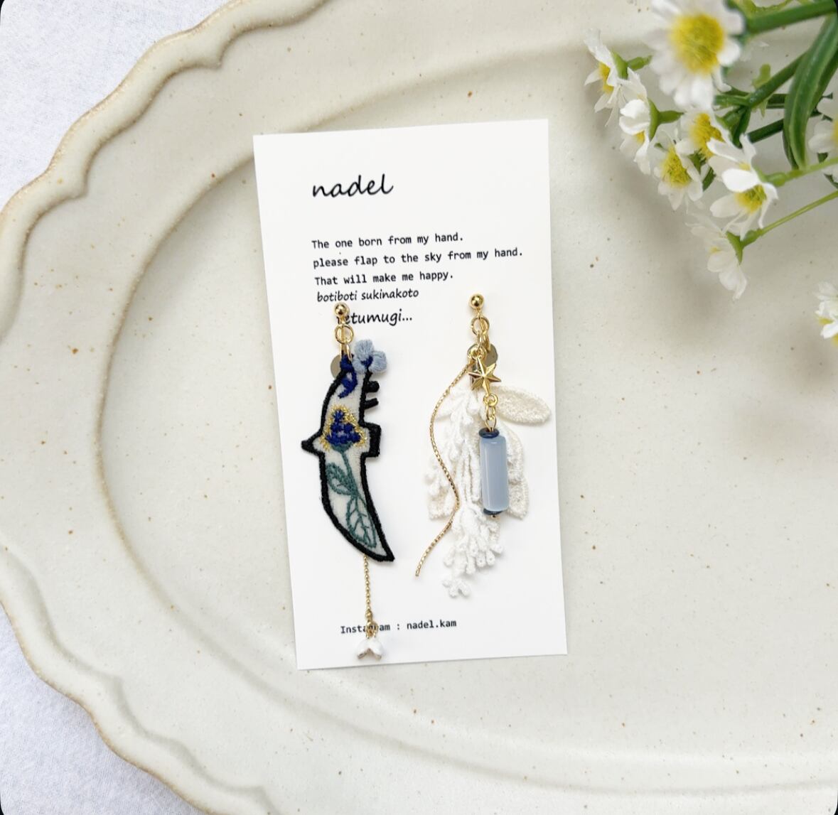 主にお花・ちょうちょ・トリなどのモチーフを手刺繍で制作し、異素材のものとミックスしてアクセサリーを作っております。