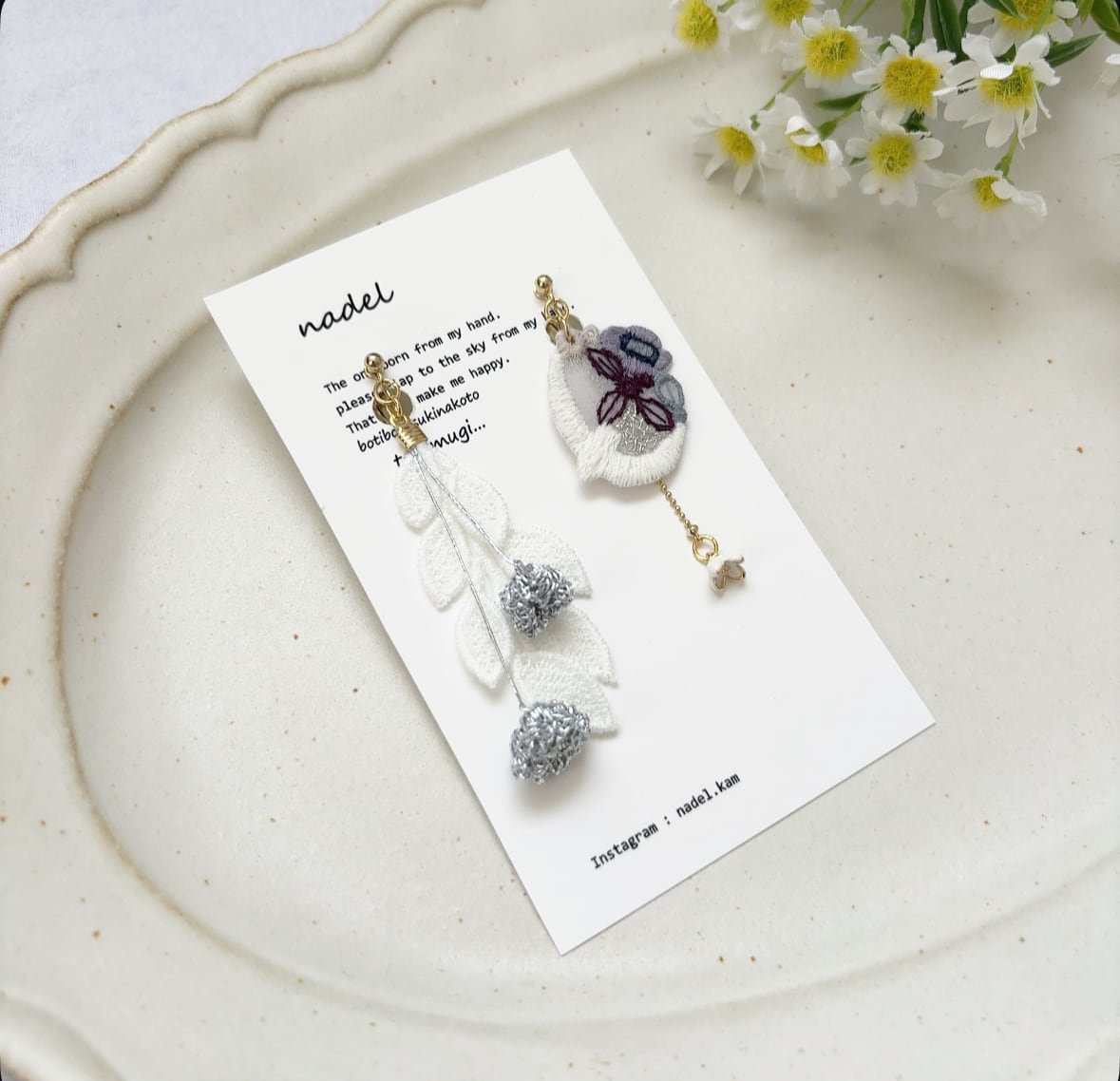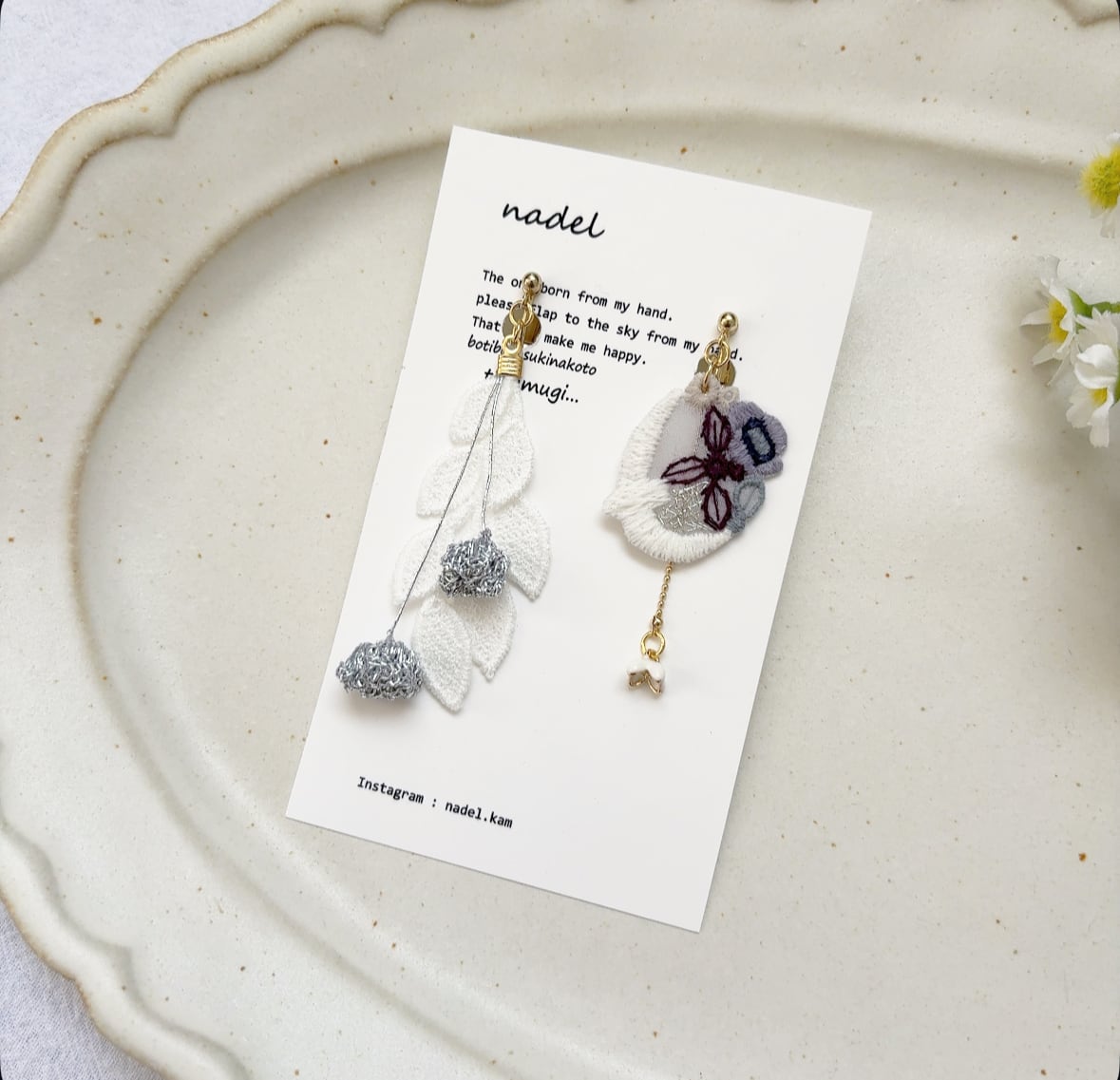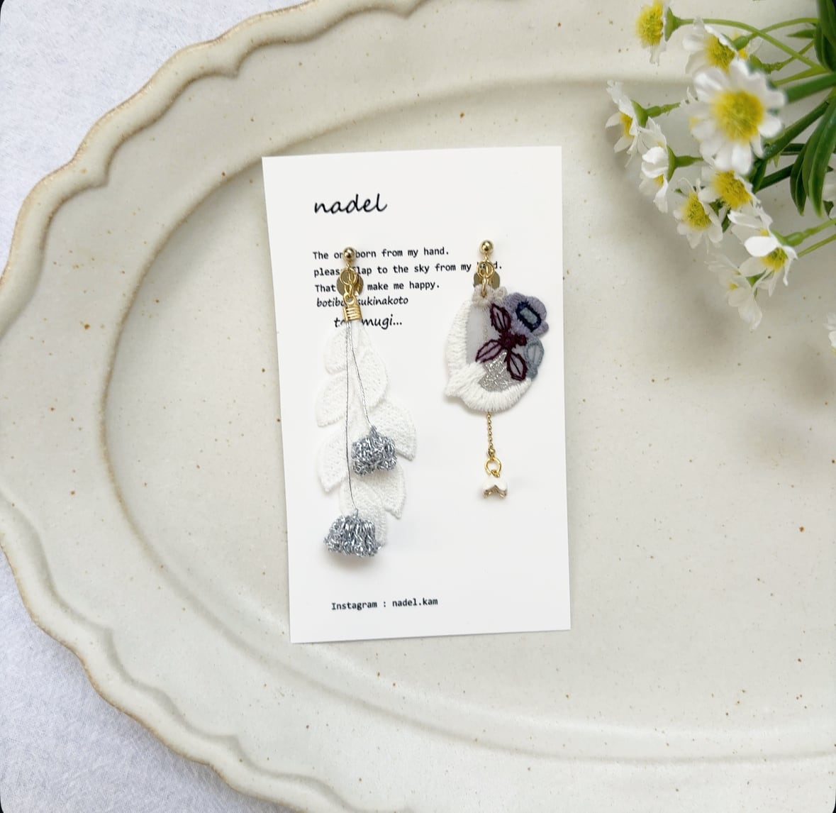 主にお花・ちょうちょ・トリなどのモチーフを手刺繍で制作し、異素材のものとミックスしてアクセサリーを作っております。