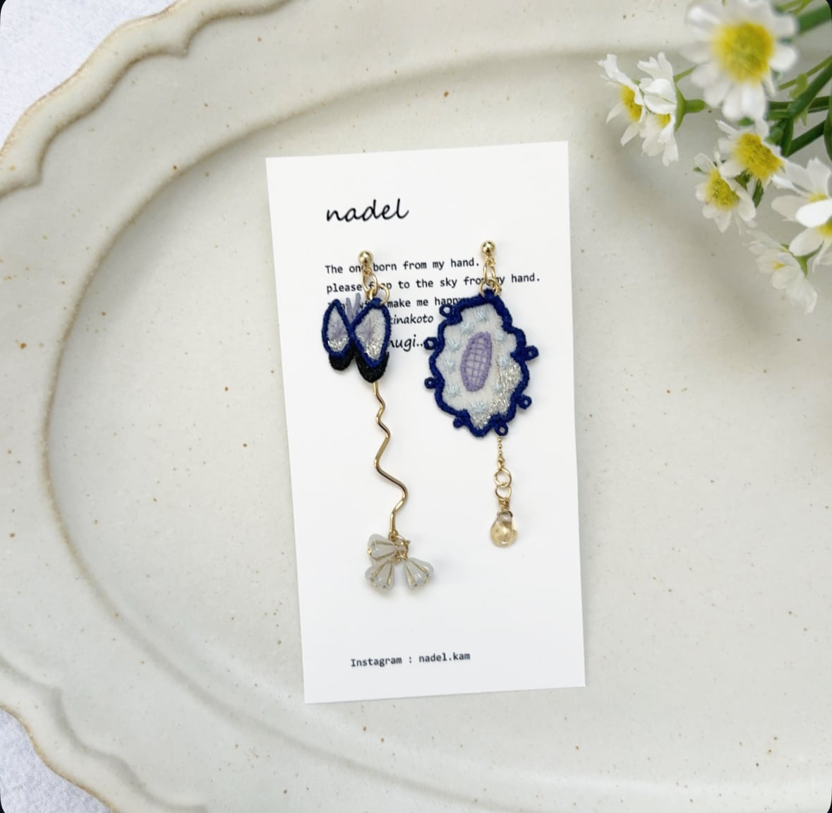 主にお花・ちょうちょ・トリなどのモチーフを手刺繍で制作し、異素材のものとミックスしてアクセサリーを作っております。