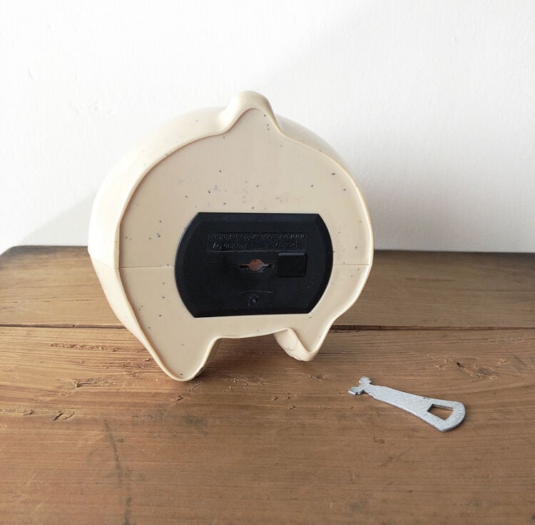 貯金箱に入れたお金は付属の鍵を使い、底の蓋を開閉することで取り出すことができます。
